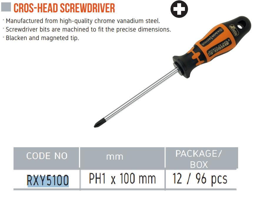 Tua vít 4 cạnh PH1 x 100mm Retta RXY5100 Thổ Nhĩ Kỳ Model:RXY5100 Chiều dài:100mm Là dụng cụ cầm tay, chuyên dùng để vặn, siết đóng ốc vít bằng tay. Sản phẩm được gia công rất
