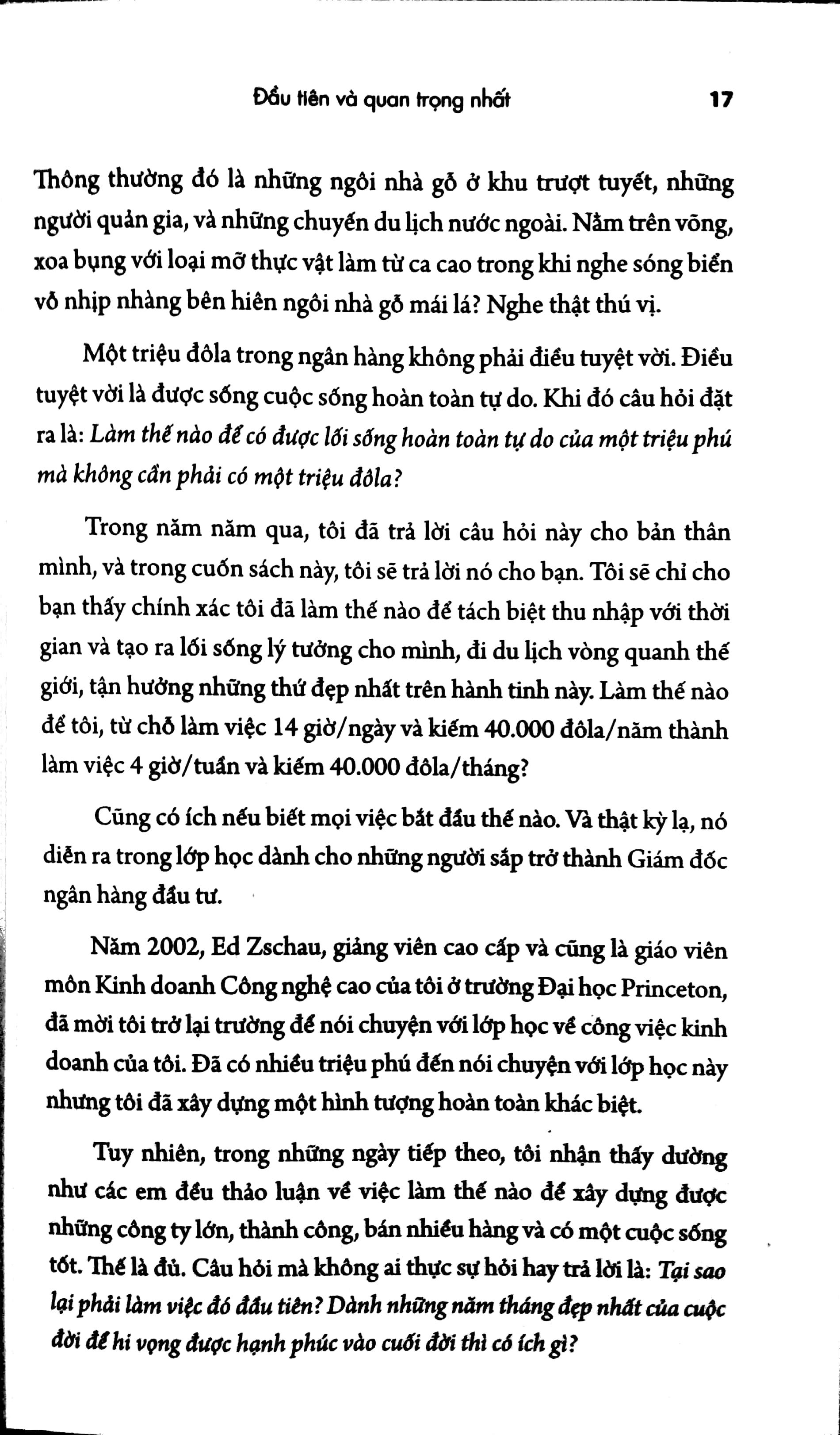 Trong cuốn sách này, Tim sẽ chỉ cho chúng ta thấy Làm thế nào để có được lối sống hoàn toàn tự do của một triệu phú mà không cần phải có 1 triệu đô la? Chỉ có một câu trả lời đơn giản, anh đã biết tách biệt thu nhập với thời gian và tạo ra lối sống lý tưởng cho mình, đi du lịch vòng quanh thế giới và tận hưởng những điều thú vị nhất trên hành tinh này. Và Tim còn chỉ cho bạn anh đã làm như thế nào để từ làm việc 14 giờ/ngày và kiếm 40.000 đô-la/ năm thành làm việc 4 giờ/ tuần và kiếm 40.000 đô la/ tháng?