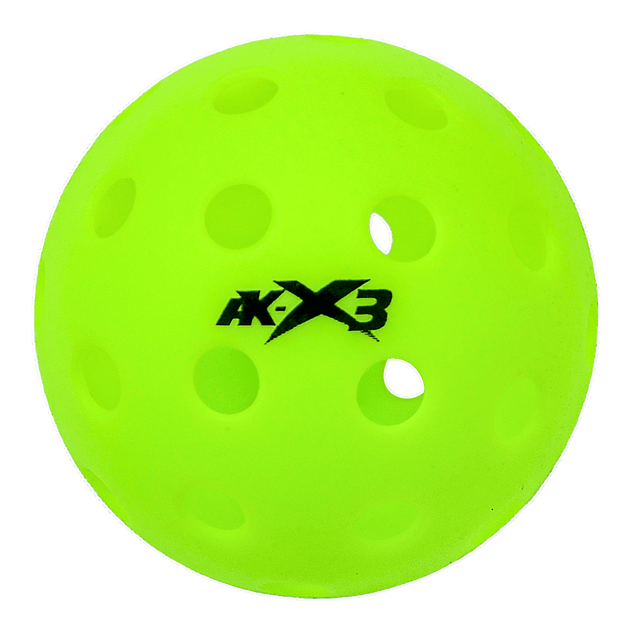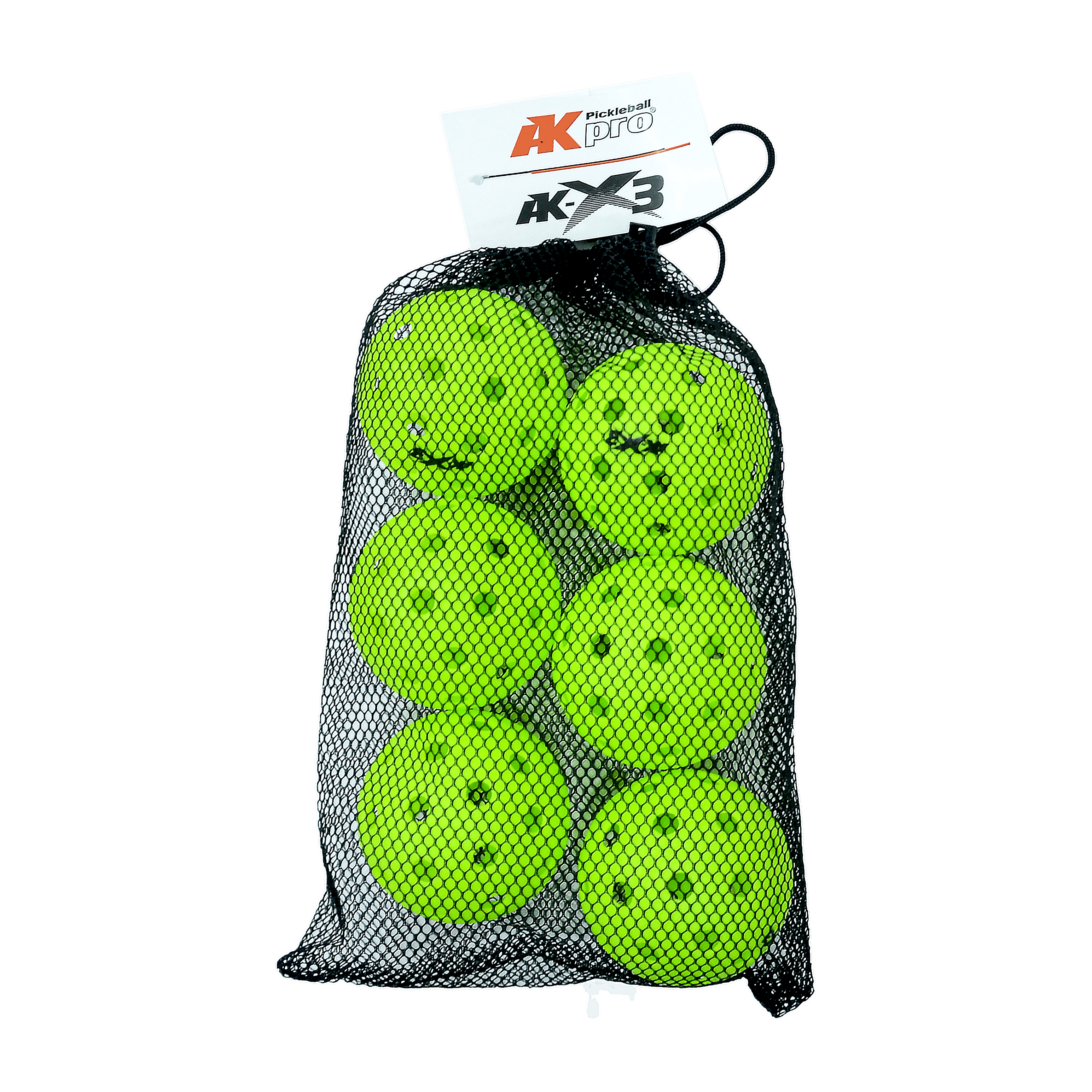 Túi 6 bóng Pickleball AK-X3 sử dụng vật liệu TPE cao cấp được ép 2 mảnh chắc chắn, 40 lỗ. Trọng lượng, kích thước và độ nảy tiêu chuẩn tập luyện ngoài trời. Bóng có đường bay ổn định, bám mặt vợt và rất bền.