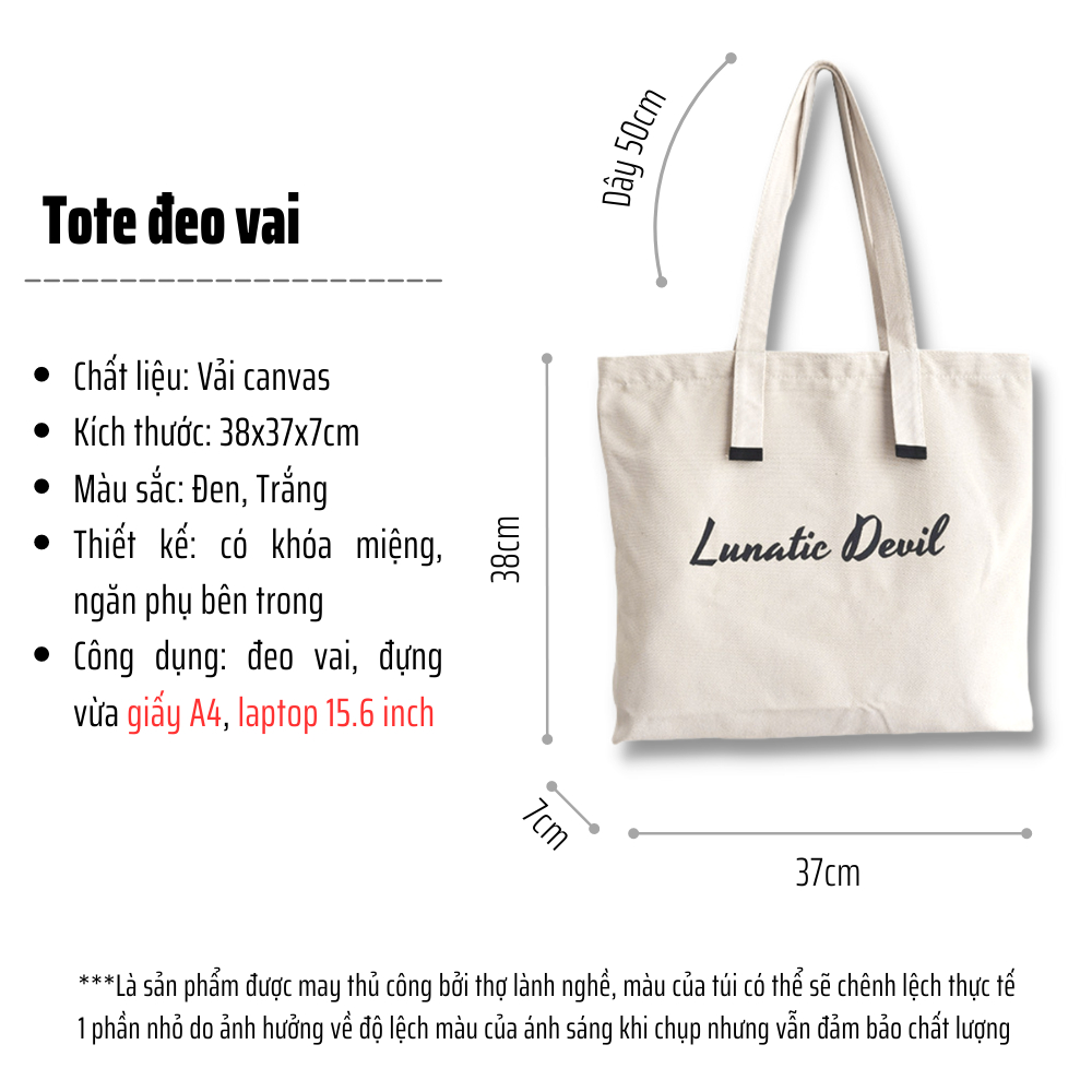 THÔNG TIN SẢN PHẨM - Chất liệu: Vải canvas 600PVC (65% Cotton, 35% Poly) + Đáy túi: 15cm + Ngang: 35cm + Cao: 42cm - Túi tote được mệnh danh là chiếc túi thời trang