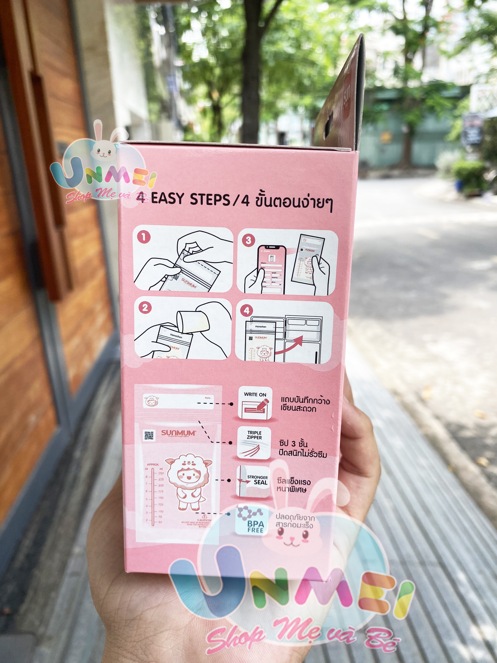 Mua tại TiktokTúi trữ sữa Sunmum 250ml (hộp 50 túi) Giới thiệu Túi trữ sữa Sunmum được làm từ chất liệu cao cấp, an toàn cho sức khỏe của trẻ nhỏ. Bên cạnh đó túi zip trữ sữa Sunmum mang đến sự tiện lợi cho mẹ khi bảo quản sữa, phù hợp cho mẹ nhiều sữa hoặc trong giai đoạn đi làm không thể cho bé bú thường xuyên. Chất liệu Một trong những ưu điểm vượt trội của túi trữ sữa Sunmum đó chính là chất liệu sản phẩm an toàn, không chứa BPA, được khử trùng bằng tia Gamma. Túi trữ sữa cao cấp được làm từ chất liệu LLDPE/LDPE có polyethylene mật độ thấp. Đặc điểm thiết kế này của túi trữ sữa Sunmum hộp 50 cái vô cùng an toàn với sức khỏe của bé. Túi trữ sữa Sunmum có thể chịu được nhiệt độ cao, mang đến sự tiện lợi cho mẹ khi giã đông sữa. Đặc điểm nổi bật Chất liệu an toàn