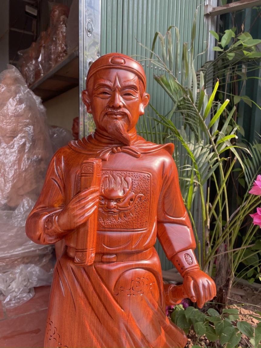 _ Tượng được trạm khắc tỉ mỉ ,tinh sảo kỳ công .Đi hầu hết tất cả mọi chi tiết góc ngách nội dung hoa văn của tượng đều được gọt tỉa chỉnh sửa cực kỳ sắc nét hoàn toàn bằng tay thủ công .Đồng thời tượng được kiểm định kỹ lưỡng khắt khe ,Như cho vào thẩm sấy cho gỗ khô kiệt .Mục đích trống dập nứt vênh mo mối mọt .Kết hợp với trà nhám ,đánh giấy giáp nhiều lần sờ mát lạnh .Song cho vào phun lót làm bóng mờ để giữ lại mầu sắc vân gỗ tự nhiên .Tượng được làm và hoàn thiện do bàn tay khối óc tài hoa .Từ những người thợ giàu kinh nghiệm trong làng nghề truyền thống .