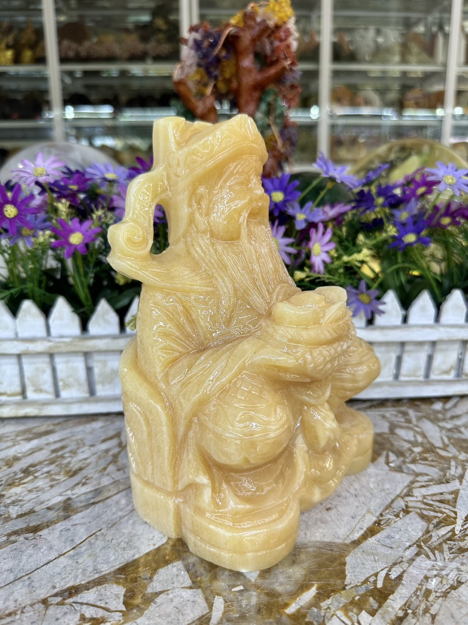 Chất liệu: Đá ngọc hoàng long Kích thước: Dài 15 cm x Rộng 10 cm x Cao 20 cm Khối lượng: 4,4 kg Thần Tài là vị thần trông coi tiền tài, vàng bạc, mang