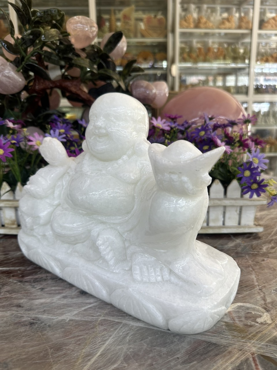 ✨Tượng Phật Di Lặc ngồi cầm thỏi vàng phong thủy đá cẩm thạch trắng - Dài 30 cm