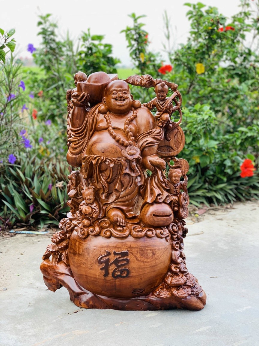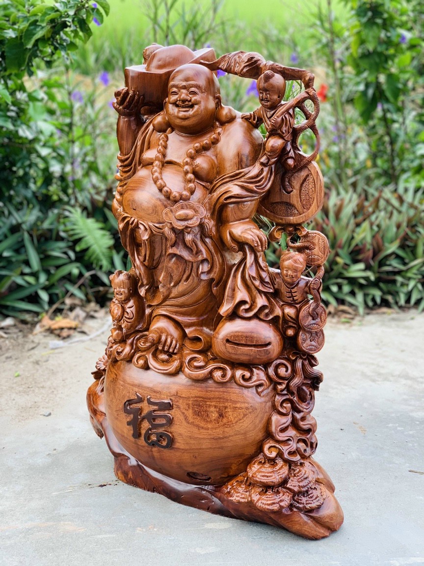 Tượng Phật Di Lặc Ngũ Phúc Gỗ Hương Việt Liền Nguyên Khối, rộng 83 cao 43 sâu 33 cm