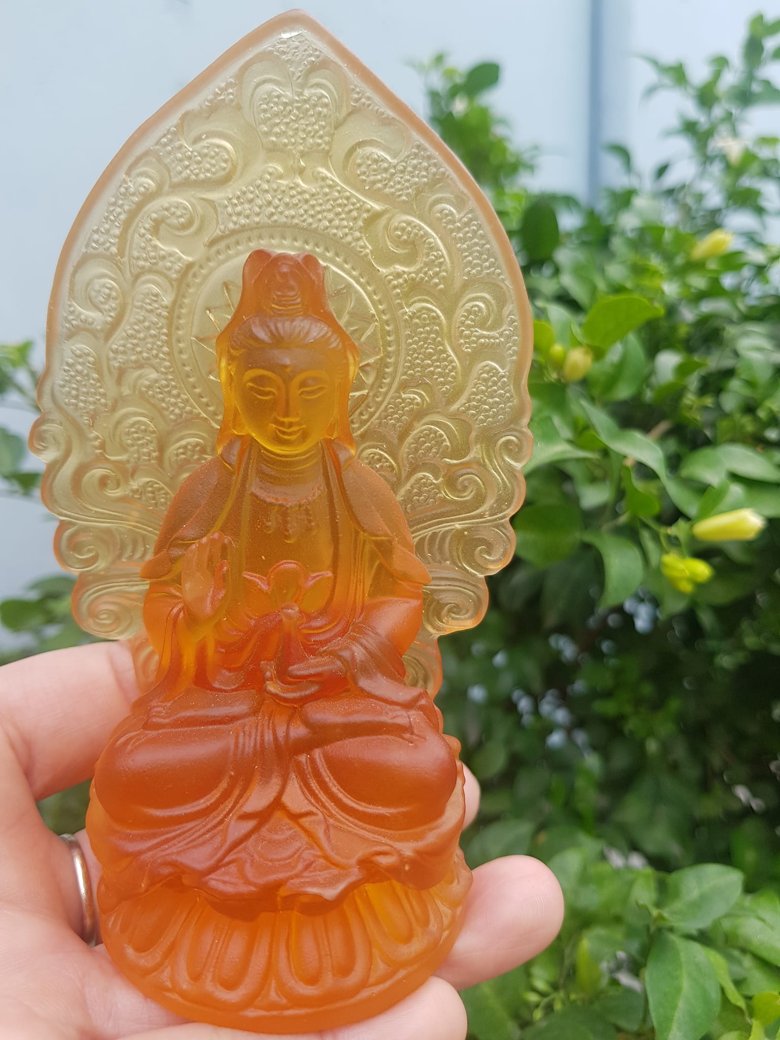 TƯỢNG PHẬT BÀ QUAN ÂM 2 MẶT ĐÁ LƯU LY VÀNG ĐẬM ĐỂ TRONG XE HƠI 10cmx6cm - HÀNG PHONG THUỶ SUNNY Q8