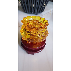 Tượng Phong Thủy Thố tụ tài mới miệng kiểu màu vàng anh tài lộc 10 thỏi xiền vàng đá lưu ly tự nhiên đế gỗ size trung đk 11cm x Cao 11cm cả đế x thố cao 7,5cm Hợp ANh Chị Mệnh Kim Thổ Thuỷ đặt bàn làm...