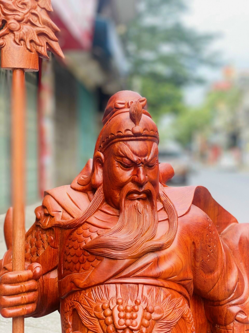 _ Tượng quan công sách đao trấn ải được làm bằng chất liệu gỗ hương đá liền khối tự nhiên 100% _ Kt cao 40×16×11cm _ Tượng quan công sách đao được trạm khắc vô