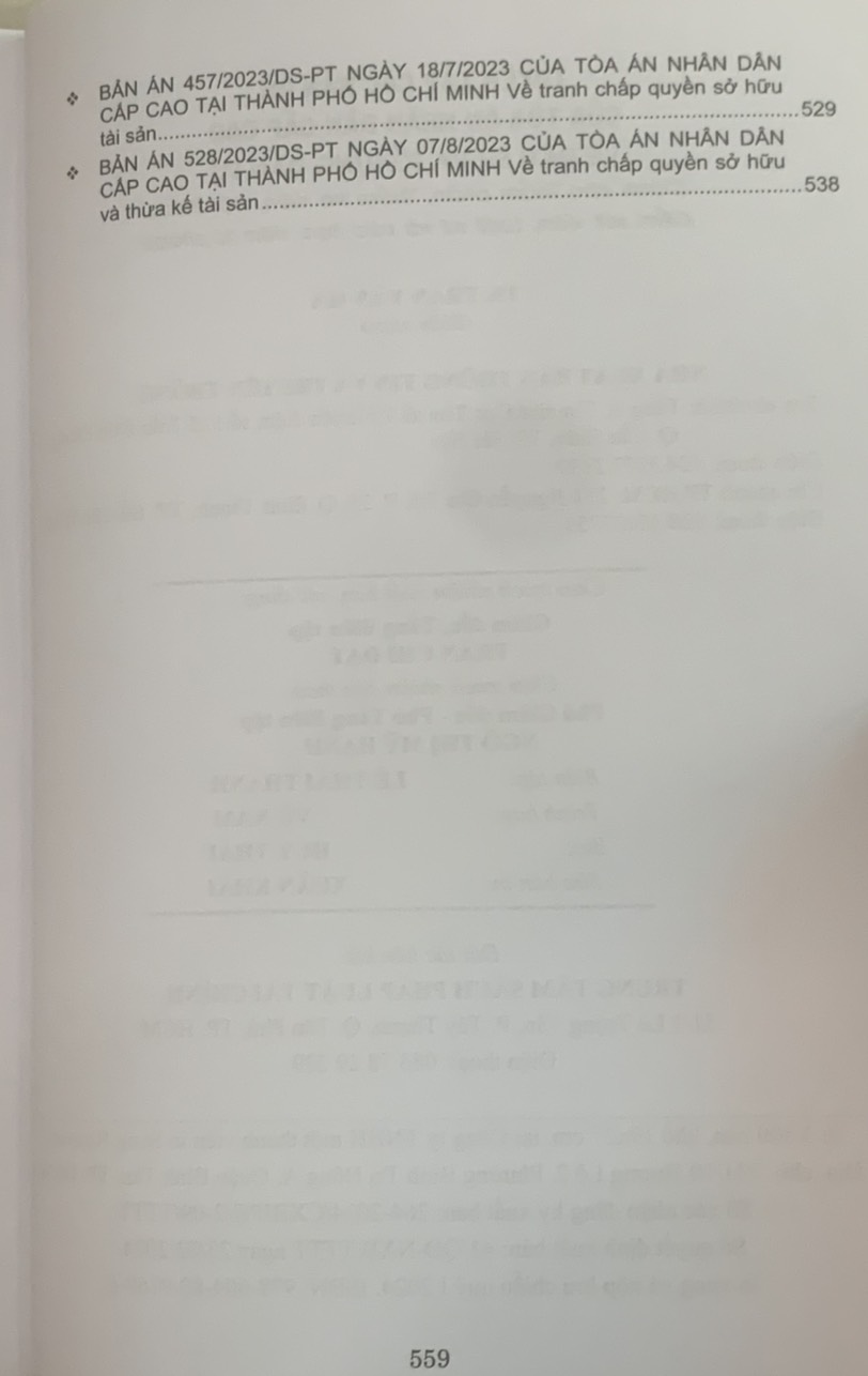 Phần thứ ba. Các Bản án của Tòa án nhân dân cấp cao về quyền sở hữu tài sản Hy vọng rằng đây sẽ là tài liệu hữu ích để bạn đọc, đặc biệt là Thẩm phán, Thẩm tra viên, Hội thẩm, Kiểm sát viên, Luật sư và các học viên tư pháp và những người làm công tác pháp luật nghiên cứu, áp dụng trong thực tiễn xét xử.
