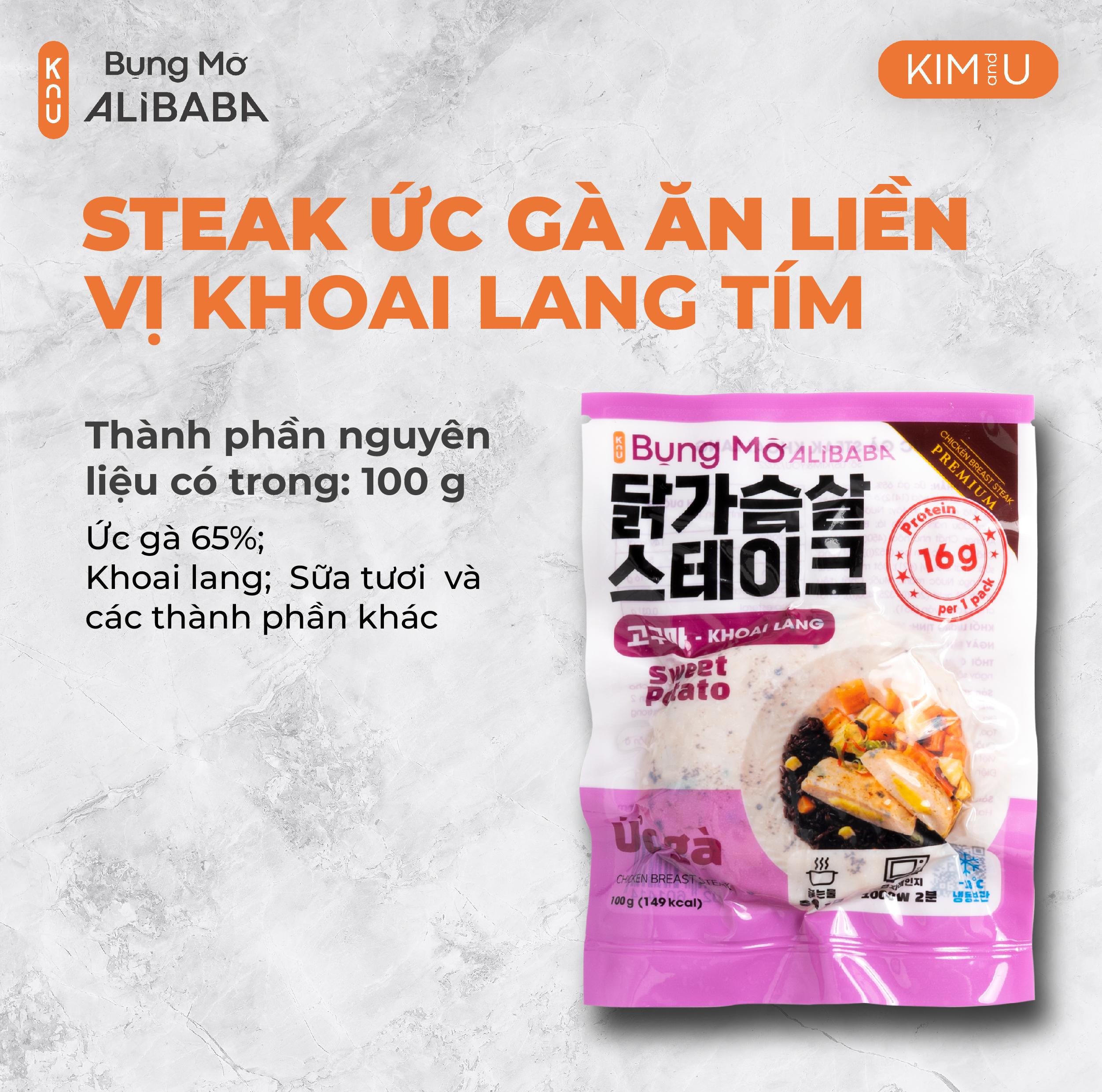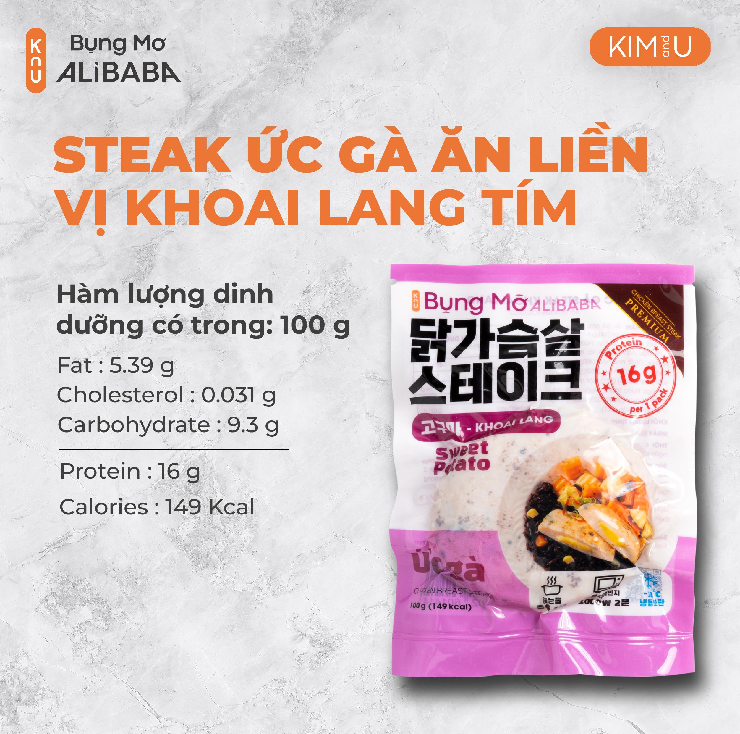 Thịt gà vị ngọt dịu ăn kèm cùng khoai lang tím nghiền thơm siêu mềm siêu ngon, mượt mà và mịn tan trong miệng. Ức Gà Steak Khoai Lang là món ăn vừa lạ vừa quen cho một bữa tối nhẹ nhàng sau một ngày bận rộn. Chỉ cần 2 phút mở gói và hâm nóng ức gà đã được cắt lát và nêm nếm sẵn là bạn đã thưởng thức bữa ăn lành ngon, tiện lợi. Thịt gà vẫn tươi nhờ giữ được độ mềm thơm đậm vị trong từng thớ thịt vẹn nguyên dưỡng chất.