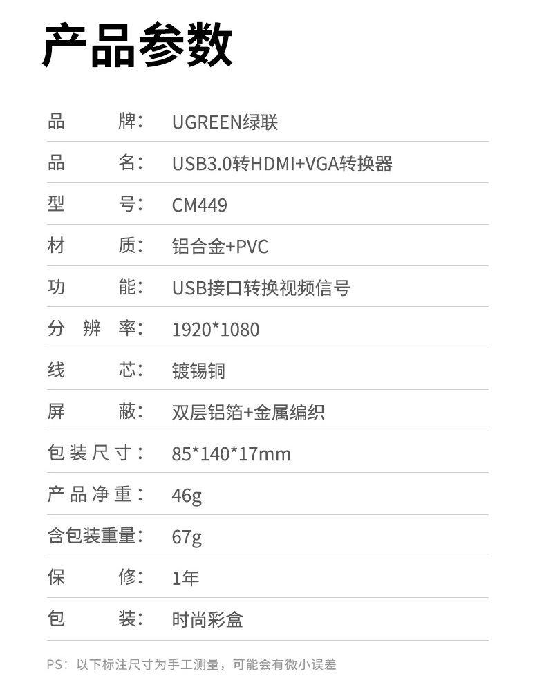 1. Features: Convert USB A signal to HDMI/VGA 2. Input: USB A 3.0 3. Output: HDMI/VGA 4. Length: 15cm 5. Resolution: 1920*1080P@60Hz 6. 248g 7. 25 x 12 x 4 cm