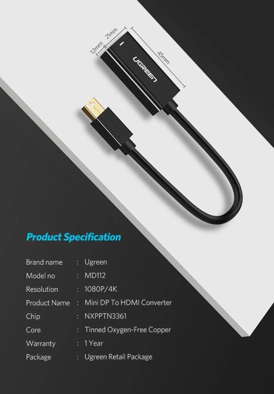 Ugreen 10460 Mini dp to HDMI female converter đầu chuyển đổi cable Support 1920*1080 60 MD112 1. Length: 18CM 2. Color : White 3. Mini DP - HDMI(âm) Full HD (1920 x 1080p) 4. 60g