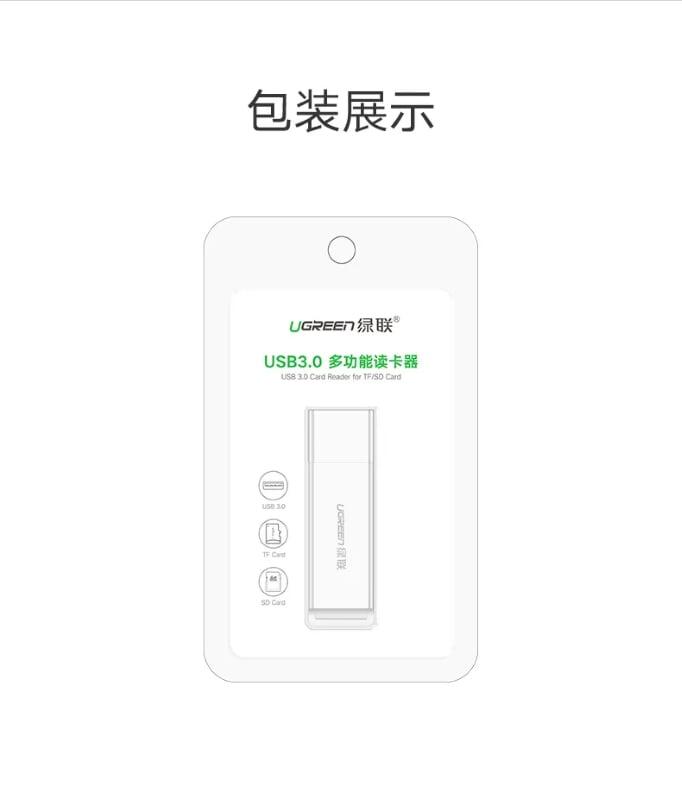 Ugreen 40753 usb 3.0 to tf + sd card readerdual card dual read white cm104 1. Input : USB 3.0 A Male 2. USB 3.0 and compatible with USB2.0 speeds up to 5Gbps 3. Output