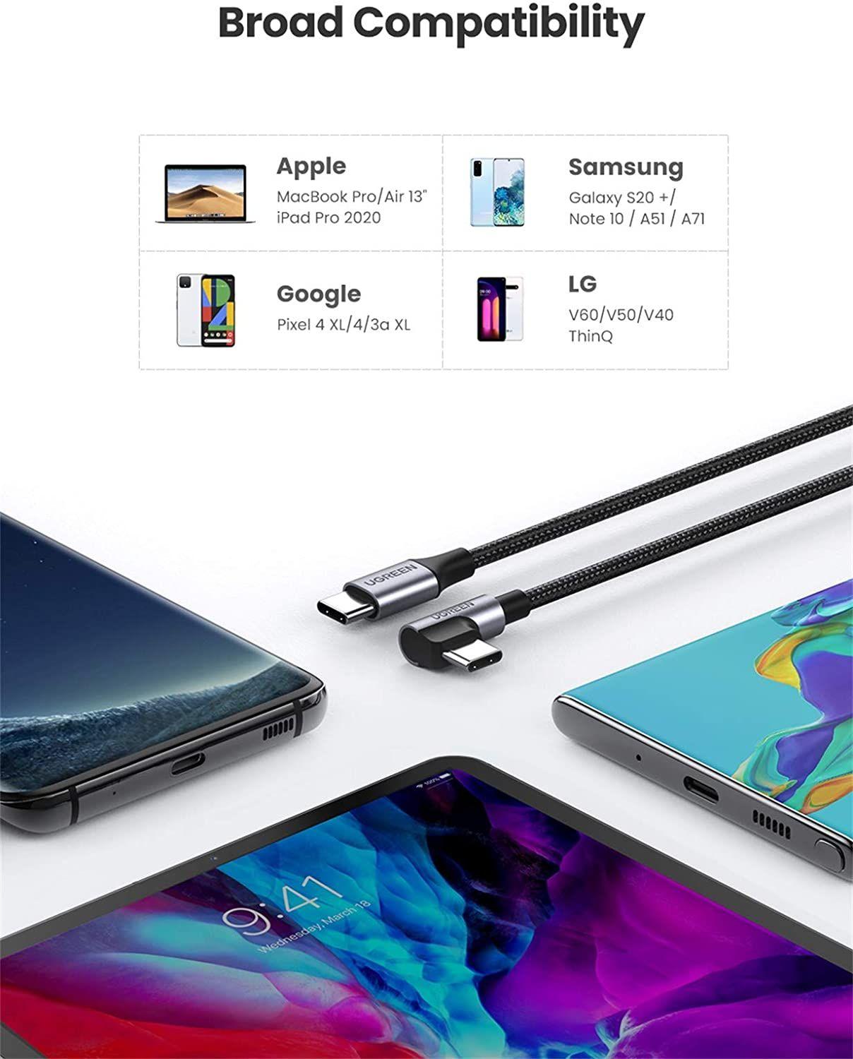 - The USB Type C to C Fast Charge Cable adopts a smart 90-degree right angled connector to avoid bending while playing games and the interference with the adjacent ports on your device.