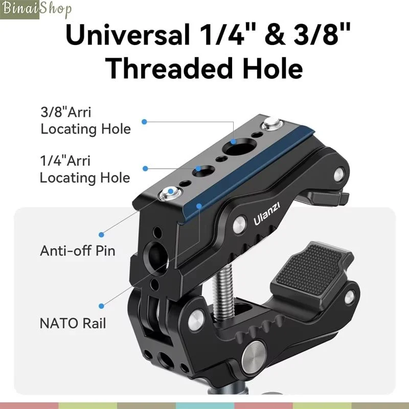 - Kẹp càng cua có độ mở từ 24-60mm, khóa giữ chắc chắn, đềm cao su chống trượt mang lại độ bám cao và an toàn trên bề mặt tròn và phẳng, khả năng tương thích rộng với lỗ ren 1/4, lỗ ren 3/8, lỗ ren Arri và thanh ray NATO...