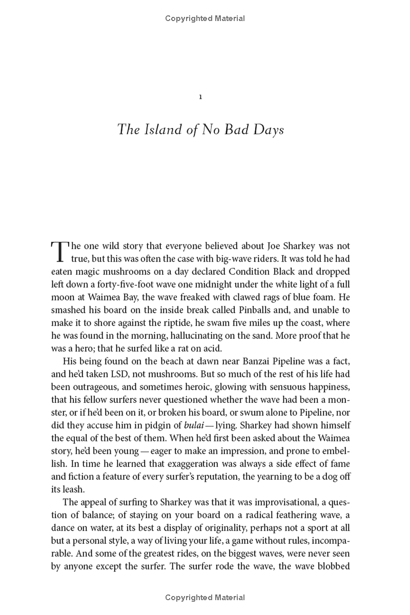 Now in his sixties, big-wave surfer Joe Sharkey has passed his prime and is losing his “stoke.” The younger surfers around the breaks on the north shore of Oahu still idolize the Shark, but his sponsors are looking elsewhere. One night, while driving home from a bar after one too many, Joe accidentally kills a stranger near Waimea, a tragedy that sends his life out of control. As the repercussions of the accident spiral ever wider, Joe’s devoted girlfriend Olive throws herself into uncovering the dead man’s identity and helping Joe find vitality and refuge in the waves again.