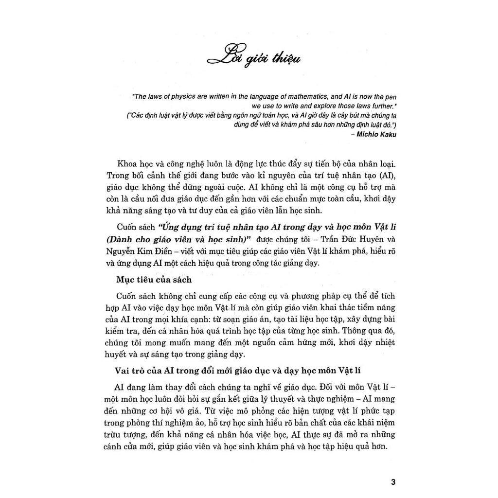 Cuốn sách “Ứng dụng trí tuệ nhân tạo AI trong dạy và học môn Vật lí (Dành cho giáo viên và học sinh)” được chúng tôi – Trần Đức Huyên và Nguyễn Kim Điền – viết với mục tiêu giúp các giáo viên Vật lí khám phá, hiểu rõ và ứng dụng AI một cách hiệu quả trong công tác giảng dạy.