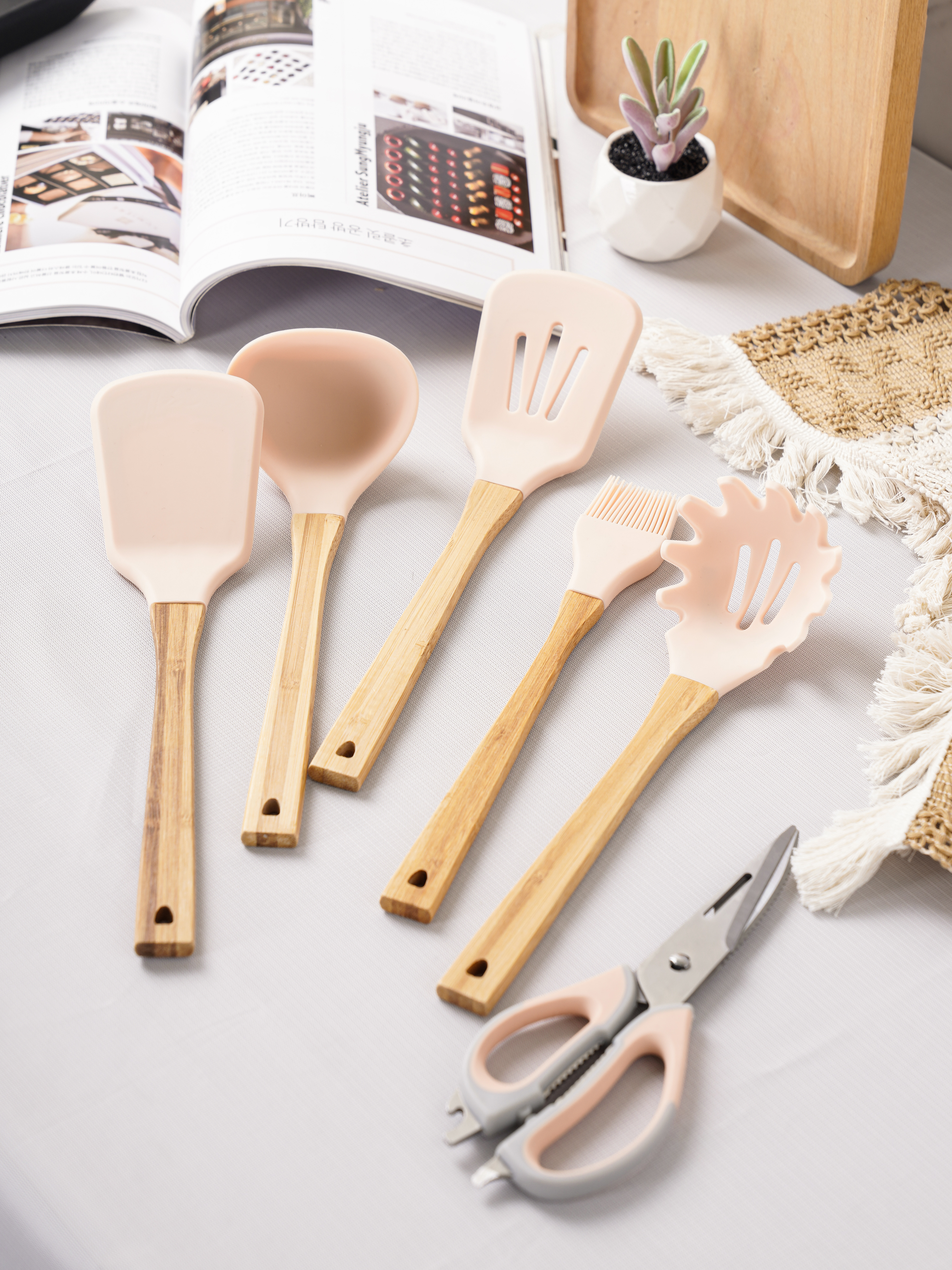 Bộ dụng cụ nhà bếp INOCHI Chất liệu: Nhựa PA cao cấp an toàn cho sức khỏe Kích thước: 145x145x394mm Đặc tính sản phẩm: - Bộ dụng cụ không làm trầy xước lớp chống dính