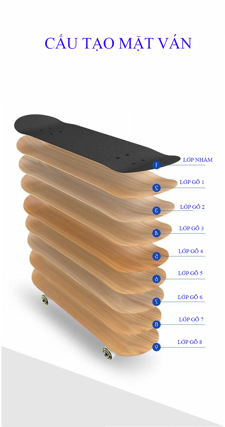 - Ván trượt thể thao có bánh xe được làm bằng chất liệu cao su dẻo màu đục, chịu lực rất bền, có khả năng bám mặt đường cao. Cùng với trục bánh xe được cấu tạo từ hợp kim nhôm cao cấp, chịu lực cao. Khả năng chịu lực lên tới 100kg. *Cấu tạo 7 lớp gỗ Coolstep tiêu chuẩn: