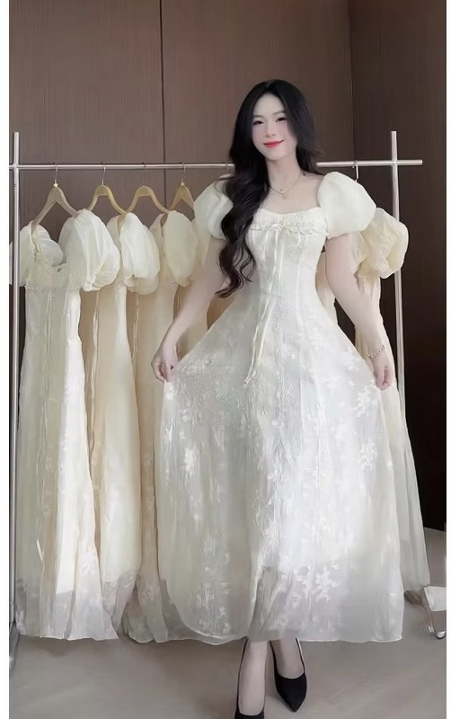Đầm Xòe Tay Phồng Dự Tiệc Form Dài Nhún Ngực Chất Liệu Voan Hoa Thêu Sang Trọng