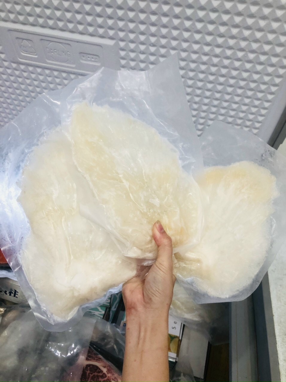 Với sản phẩm tươi sống, trọng lượng thực tế có thể chênh lệch khoảng 10%. SỤN CÁ CỜ GÒN - Xuất xứ: Việt Nam - Thành phần: Sụn cá cờ gòn - Quy cách đóng gói: 4-5 miếng/túi