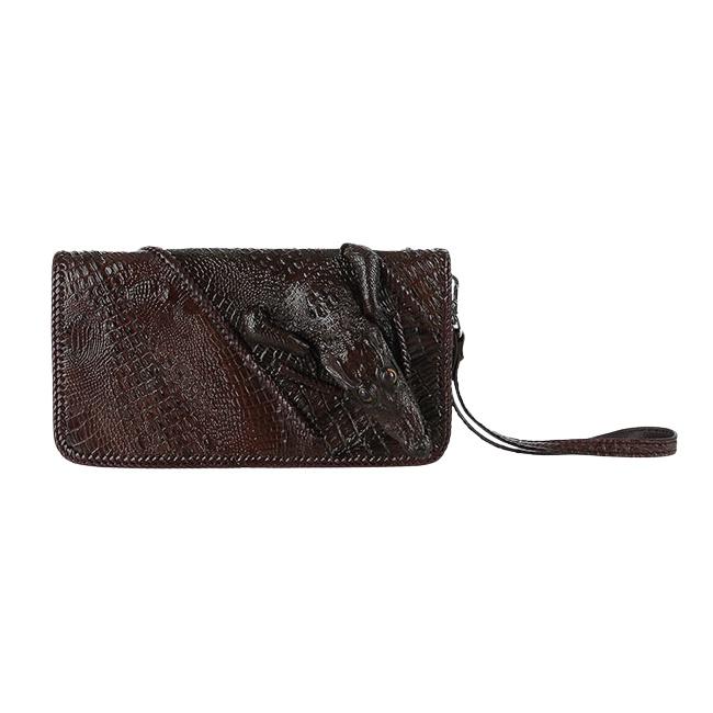 ✨Ví nữ da cá sấu Huy Hoàng nhiều ngăn đầu cá sấu đan viền màu nâu đất HC3731