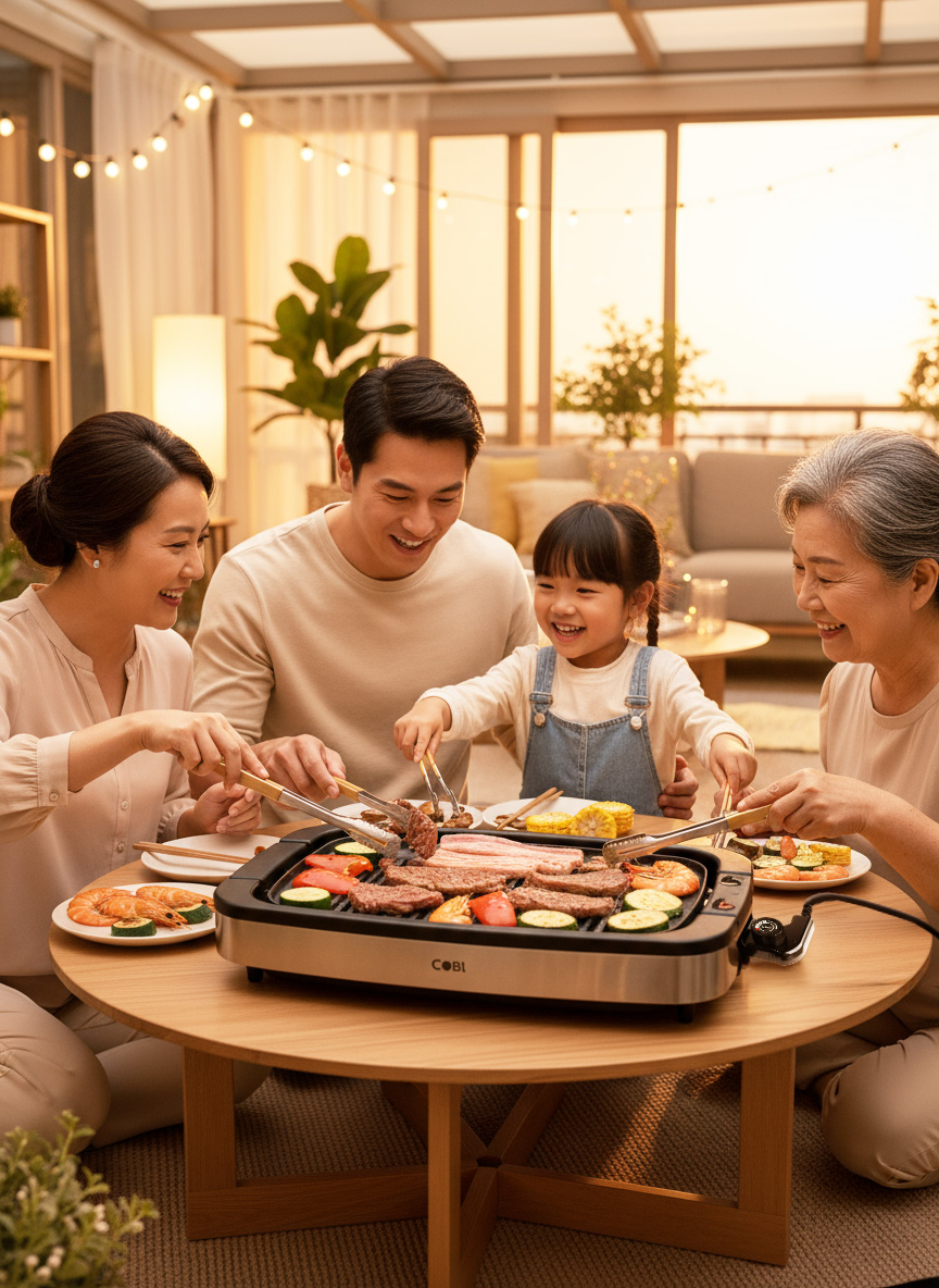 Chỉ cần vài phút chuẩn bị, bạn đã có thể cùng gia đình thưởng thức hải sản, thịt nướng, rau củ thơm lừng ngay trên bàn ăn. Không khói, không ám mùi quần áo – vỉ nướng điện COBI mang đến sự tiện lợi và không gian ấm cúng cho mọi bữa tiệc.