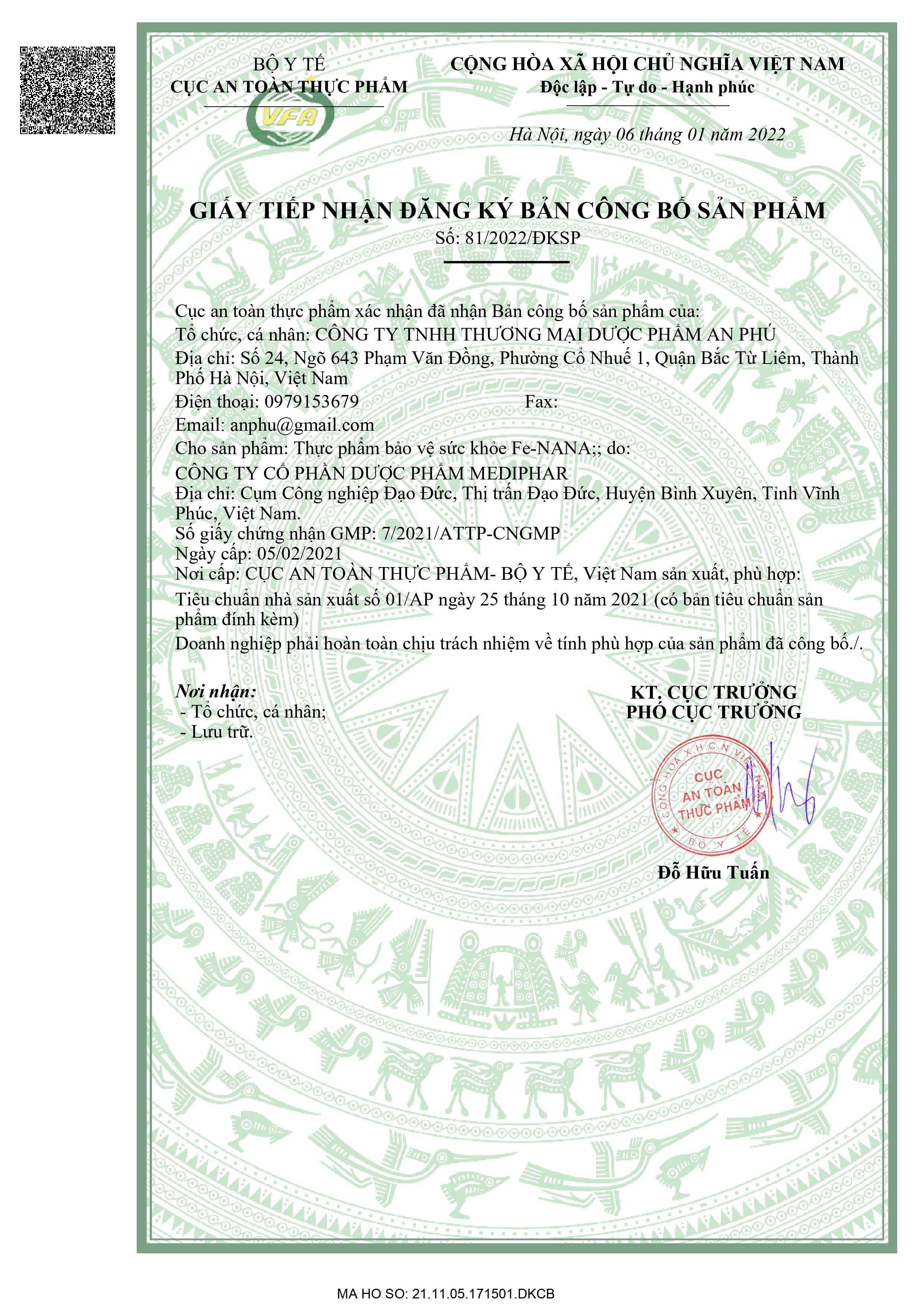 Tư vấn dinh dưỡng khi mang thai (Thạc sĩ Bác sĩ Lê Thị Hải - Giám đốc trung tâm tư vấn Viện Dinh dưỡng Quốc gia) Xuất hóa đơn cho đơn hàng từ 200.000 trở lên nếu khách hàng yêu cầu. Sản phẩm được Bộ Y tế cấp phép lưu hành toàn quốc với Số ĐKSP: 81/2022/ĐKSP THÀNH PHẦN L-Lysine HCl………………………… .100mg Galacto oligosaccharide (GOS) 70% 100mg Sắt (III) hydroxide polymalltose…………...50mg (tương đương hàm lượng sắt:………..…..8.14mg) Fructo oligosaccharide (FOS)……………   50mg DHA (Docosa Hexaenoic Acid) 10% .50mg Magnesi oxyd……………………,,………..30mg (tương đương hàm lượng Magie:………18.23mg) Kẽm gluconat………………………..……..21mg (tương đương hàm lượng Kẽm:…………3.01mg) Vitamin B1 (dạng sử dụng Thiamin mononitrat) 1mg Vitamin B6 (dạng sử dụng Pyridoxin hydroclorid) 1mg Vitamin B9 (Acid folic) (Dạng sử dụng Acid pteroymonoglutamin) 400mcg Vitamin B12 (Dạng sử dụng Cyanocobalamin) 1,2mcg Phụ liệu: Vỏ nang gelatin, tinh bột, talc, magnesi stearate vừa đủ 1 viên nang cứng. CÔNG DỤNG Hỗ trợ tăng khả năng tạo máu, giúp giảm thiếu máu do thiếu sắt. ĐỐI TƯỢNG DÙNG Người lớn và trẻ em thiếu máu do thiếu sắt CÁCH DÙNG Trẻ em trên 6 tuổi: uống 1 viên/lần/ngày, uống sau ăn. Người lớn, phụ nữ mang thai và cho con bú: uống 1 viên/lần x 2 lần/ngày, uống sau ăn.