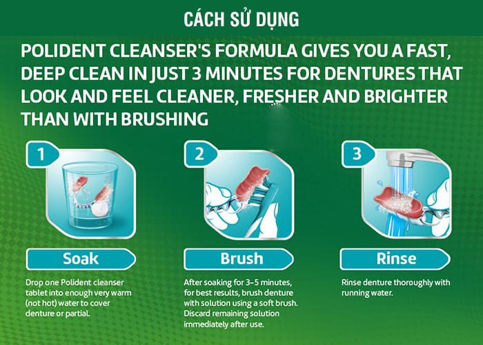 Xuất xứ: Nhật bản Hộp: 132 viên   Ưu điểm vượt trội của viên sủi ngâm làm sạch răng giả 3 Minute:    Công thức độc đáo giúp làm sạch đến 99,99% vi khuẩn, bảo vệ hàm răng giả sạch sẽ, tươi sáng  Antibacterial Denture Cleanser còn khử cả mùi hôi khó chịu   Làm giảm sự tích tụ của mảng bám, cao răng   Loại bỏ cả những chất bẩn ở bên trong kẽ răng, nơi khó tiếp cận   Giúp hàm răng giả luôn tươi mới, ngăn chặn những dấu hiệu sâu răng, hư hỏng, ố vàng   Chỉ mất 3 phút để viên sủi hoạt động và mang lại hiệu quả cao.   Đối với viên sủi , không cần bàn chải, không cần tác động vật lý, không chà xát trực tiếp lên bề mặt răng, nên sẽ giúp bảo quản răng giả được tốt hơn, duy trì độ sáng và mới của nó.    Viên sủi trắng răng  được điều chế theo chuẩn nha khoa, không sử dụng chất tẩy trắng độc hại hoặc các hoạt chất gây bào mòn hay hư hại đến răng.    Thiết kế từng viên sủi bọc cực kỳ dễ dùng và bảo quản được tốt, dễ mang theo khi cần thiết.    Thành phần viên sủi vệ sinh răng giả : Natri bicacbonat, axit xitric, kali monopersulfat, natri cacbonat, natri cacbonat peroxit, TAED, natri benzoat, PEG-180, natri lauryl sulfat, đồng trùng hợp VP / VA, hương vị, kẹo cao su xenlulo, FD&C blue 2, blue 1 lake, amarillo 5, amarillo 5.   Cách sử dụng viên sủi: