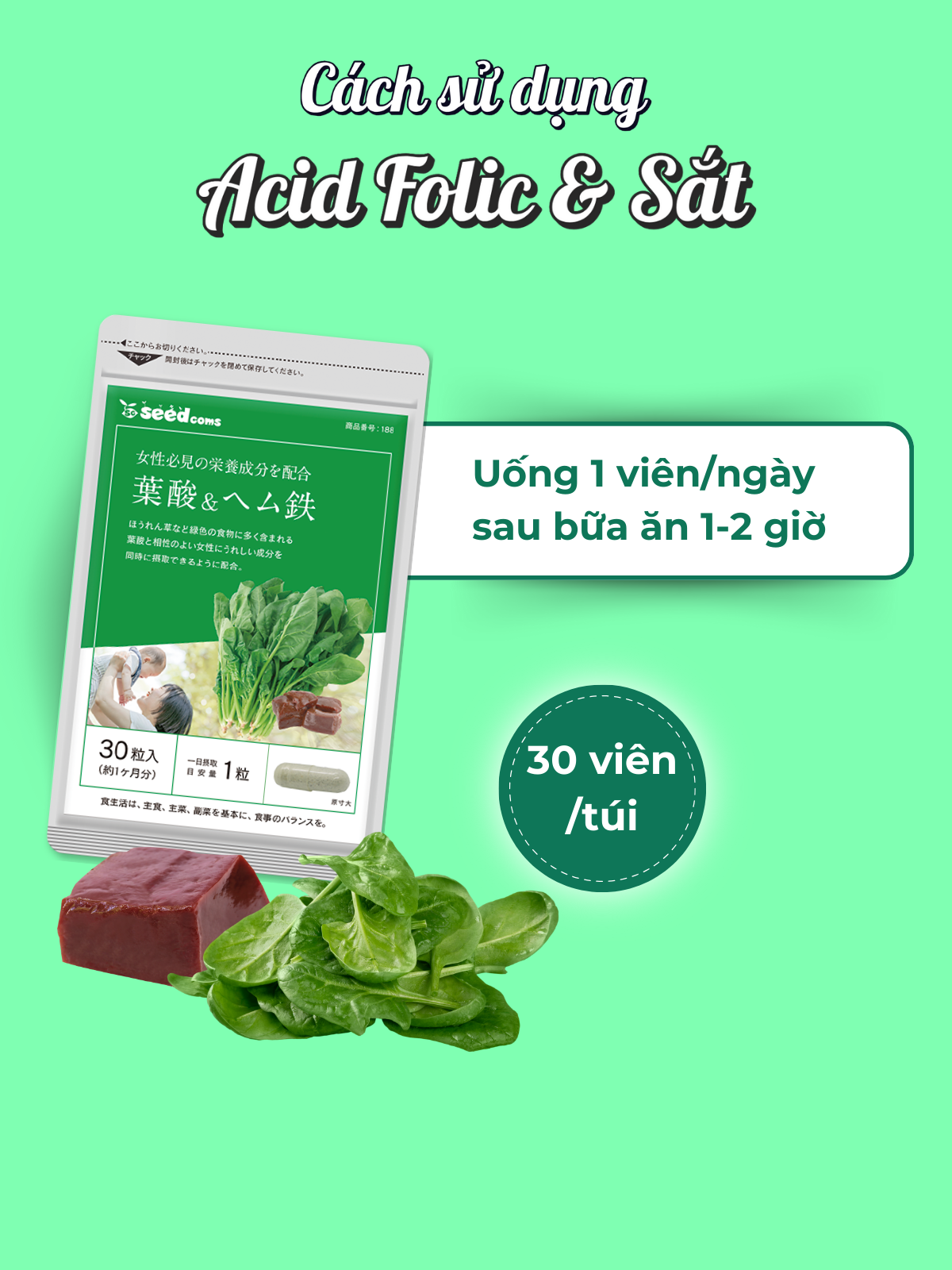 ✨Viên Uống Bổ Sung Acid Folic & Sắt Hỗ Trợ Bổ Máu Seedcoms Nhật Bản