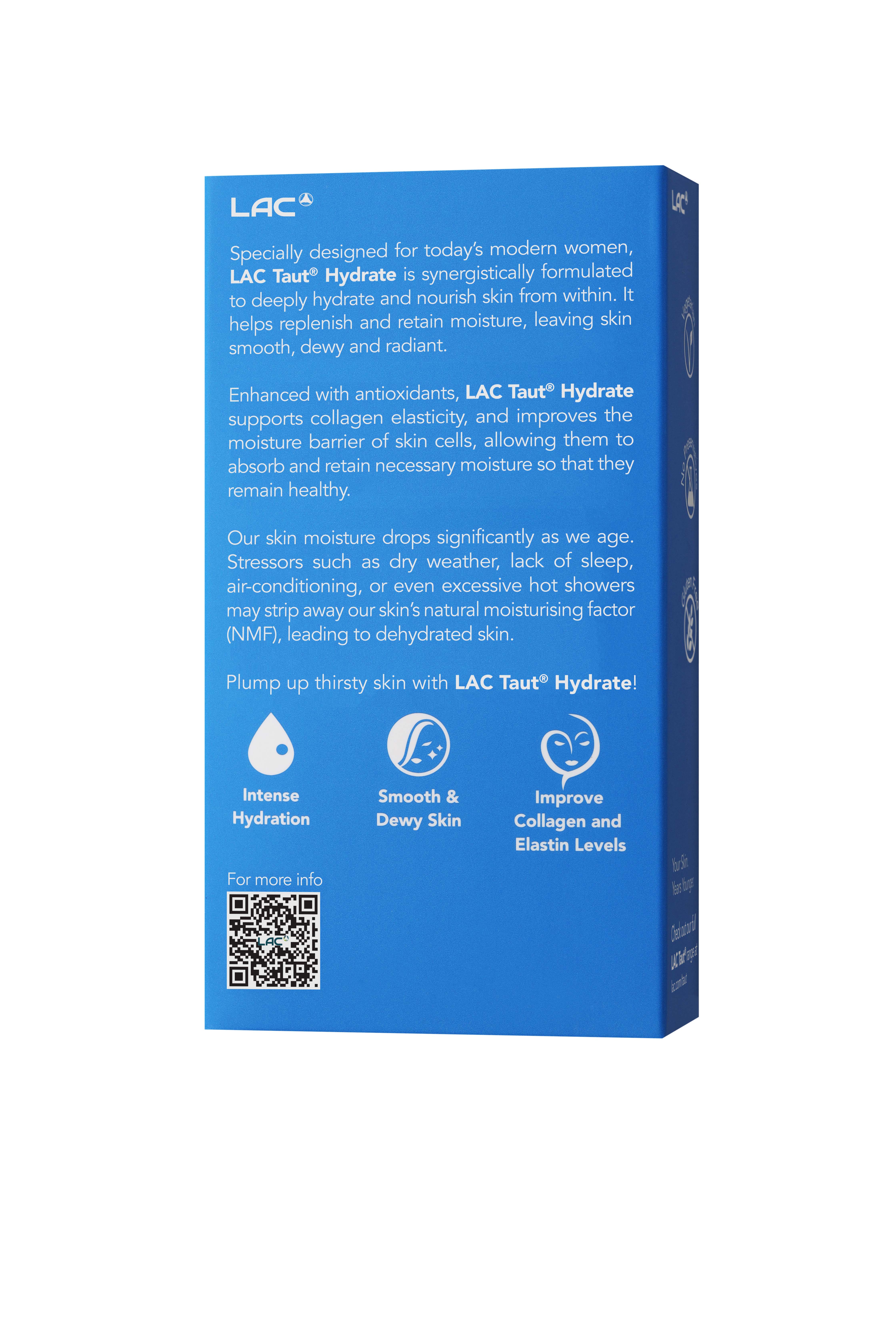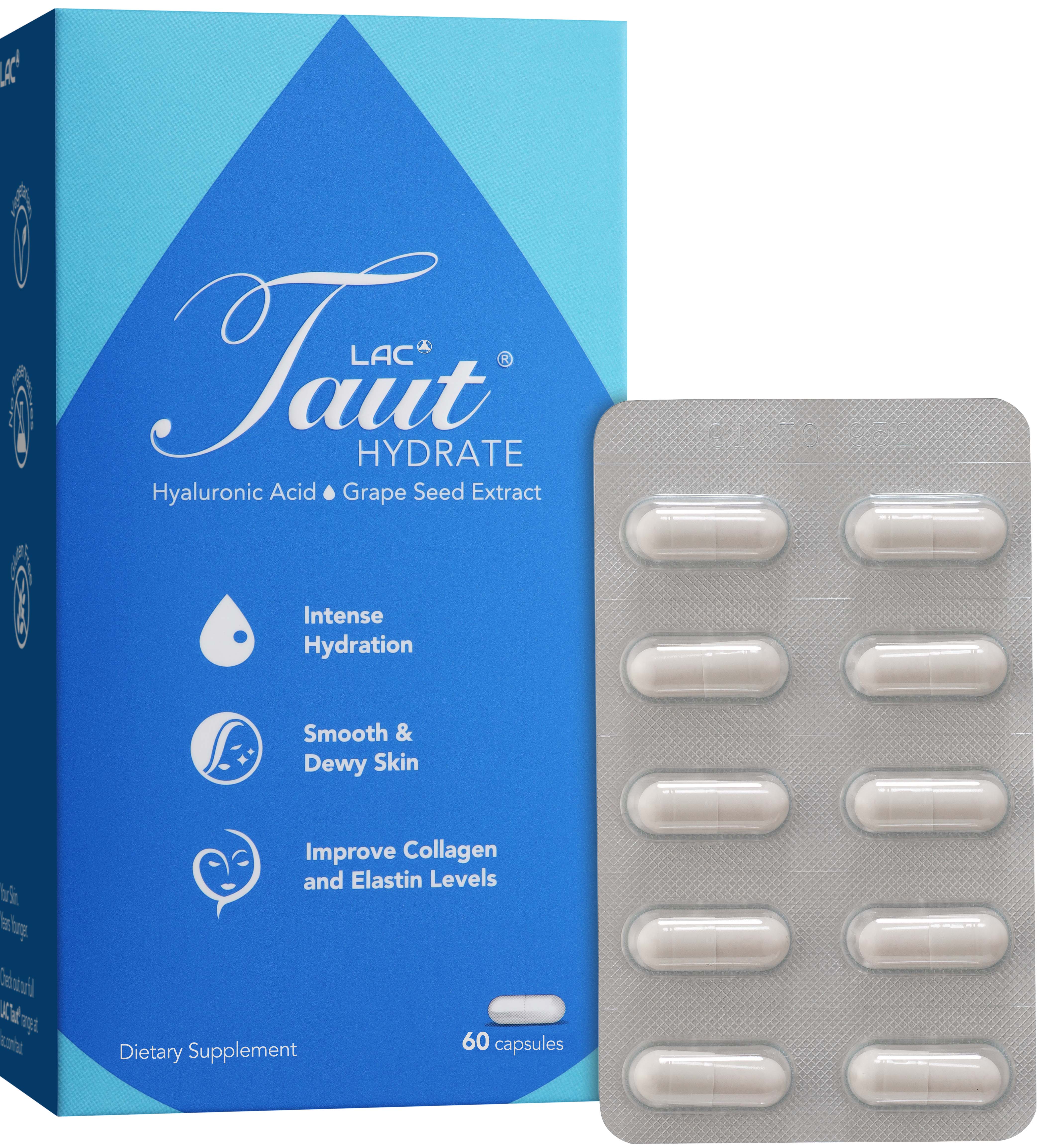 VIÊN UỐNG BỔ SUNG CHẤT DƯỠNG ẨM LAC TAUT HYDRATE (60 VIÊN) chứa dưỡng chất dưỡng ẩm cho da - Hyaluronic Acid (chất giữ ẩm) và chiết xuất hạt nho (chất chống oxy hóa) cung cấp dưỡng chất dưỡng ẩm giúp tăng cường khả năng phòng vệ chống lại tác động làm khô da cũng căng thẳng cho da do tiếp xúc với nắng nóng và máy lạnh. Giữ gìn kết cấu làn da tươi trẻ