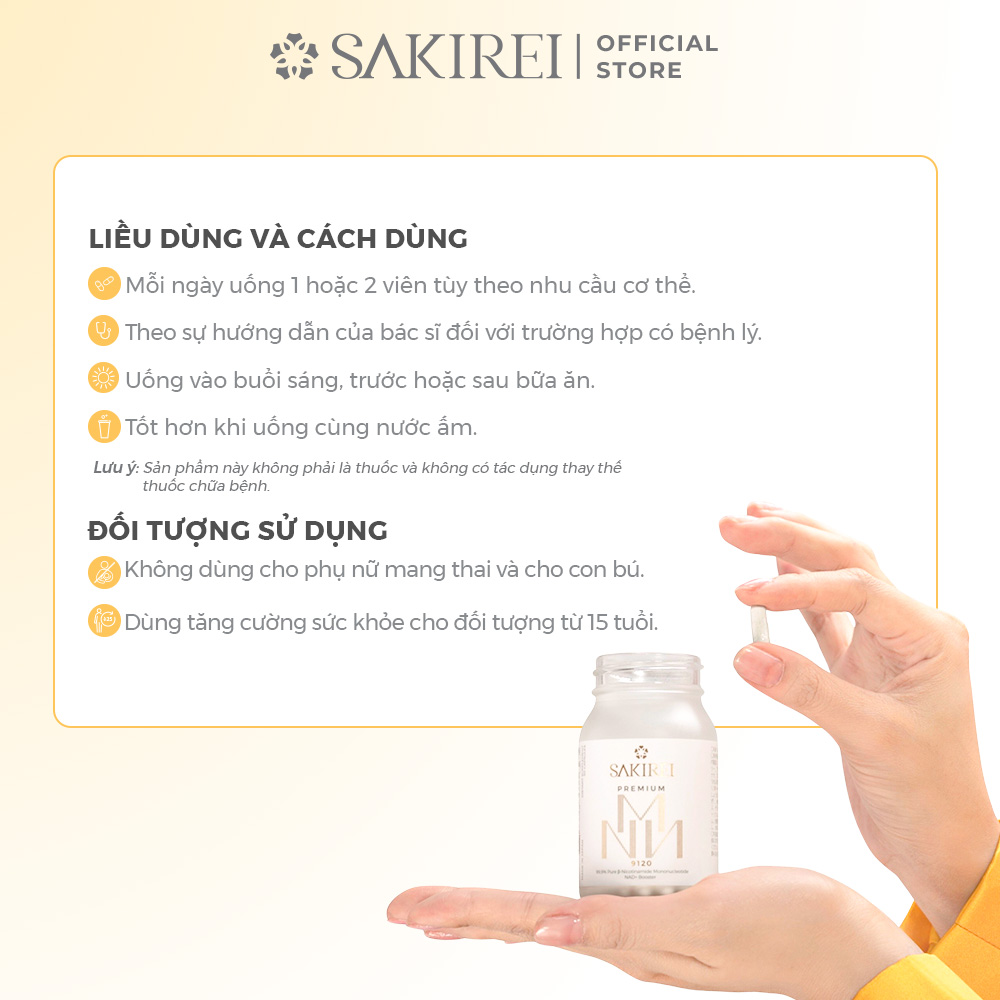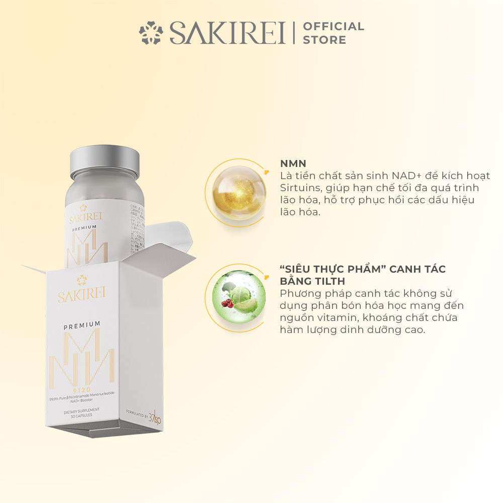 Với tổng hàm lượng NMN lên đến 3.000 mg, kết hợp cùng các loại thực phẩm được canh tác theo phương pháp TILTH dồi dào dinh dưỡng, Sakirei Premium NMN 9120 là giải pháp chăm sóc sức khỏe chủ động cho người cần bổ sung năng lượng để hoạt động thể lực và trí óc, phòng ngừa các vấn đề liên quan đến lão hóa sớm.