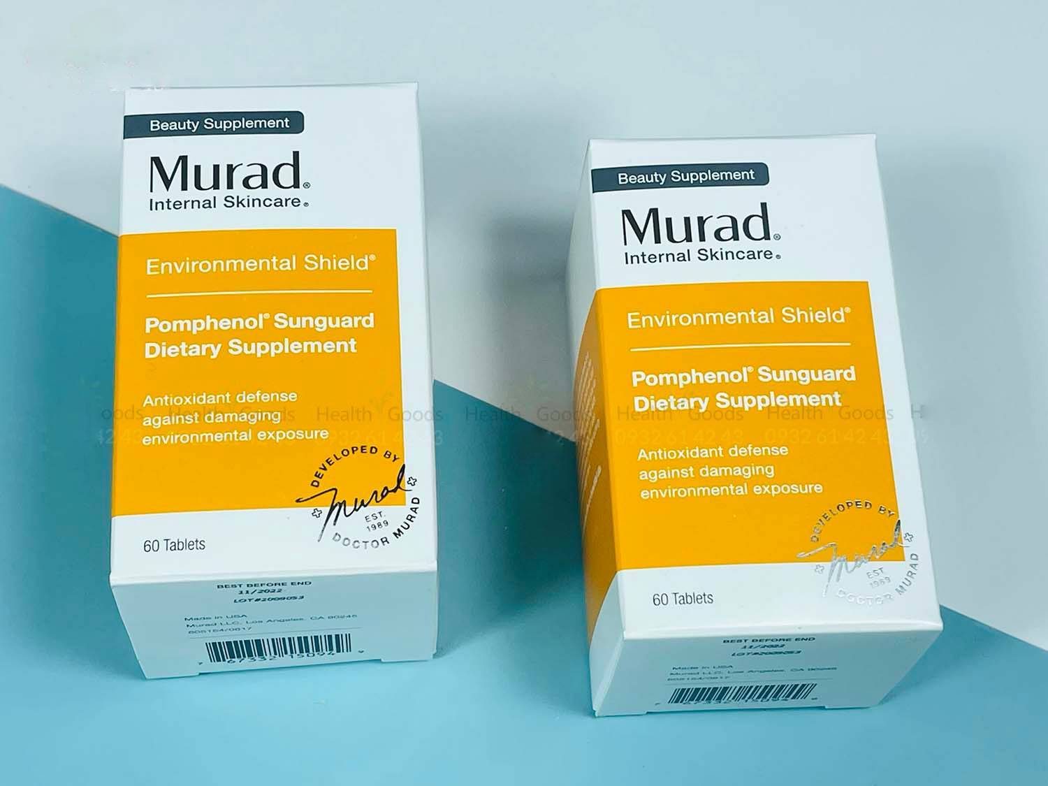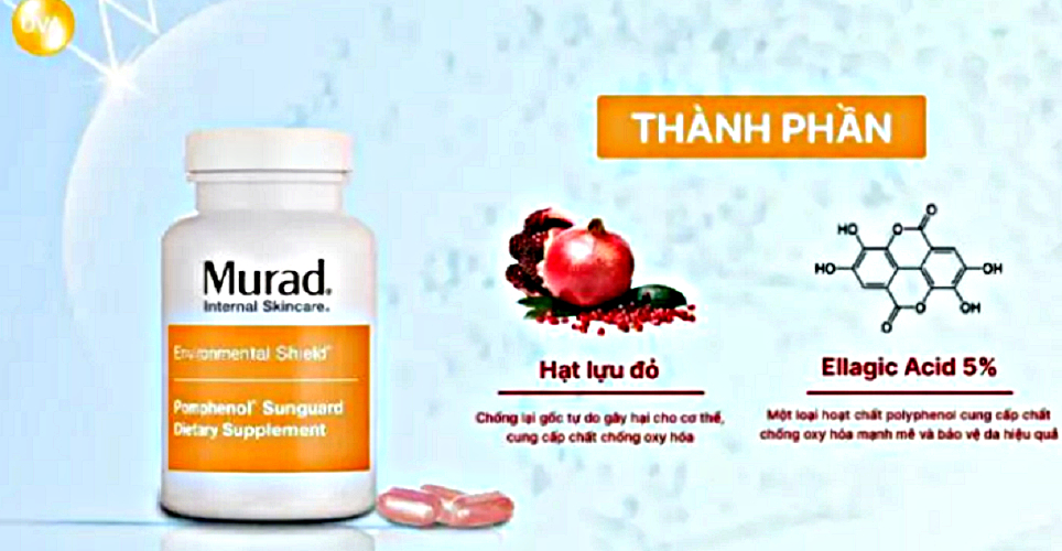 ● Thành phần chính của viên uống chống nắng Murad Pomphenol Sunguard là chiết xuất lựu đỏ, an toàn, lành tính. Sản phẩm cao cấp của Murad - Mỹ được nhiều người nổi tiếng như Đàm Vĩnh Hưng, Hứa Vỹ Văn lựa chọn.