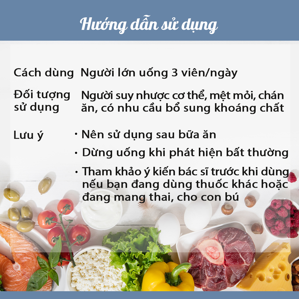 CÔNG DỤNG - Bổ sung 24 vitamin và khoáng chất thiết yếu cho cơ thể. - Hỗ trợ bồi bổ và tăng cường sức khỏe cho các trường hợp chán ăn, mệt mỏi, suy nhược cơ