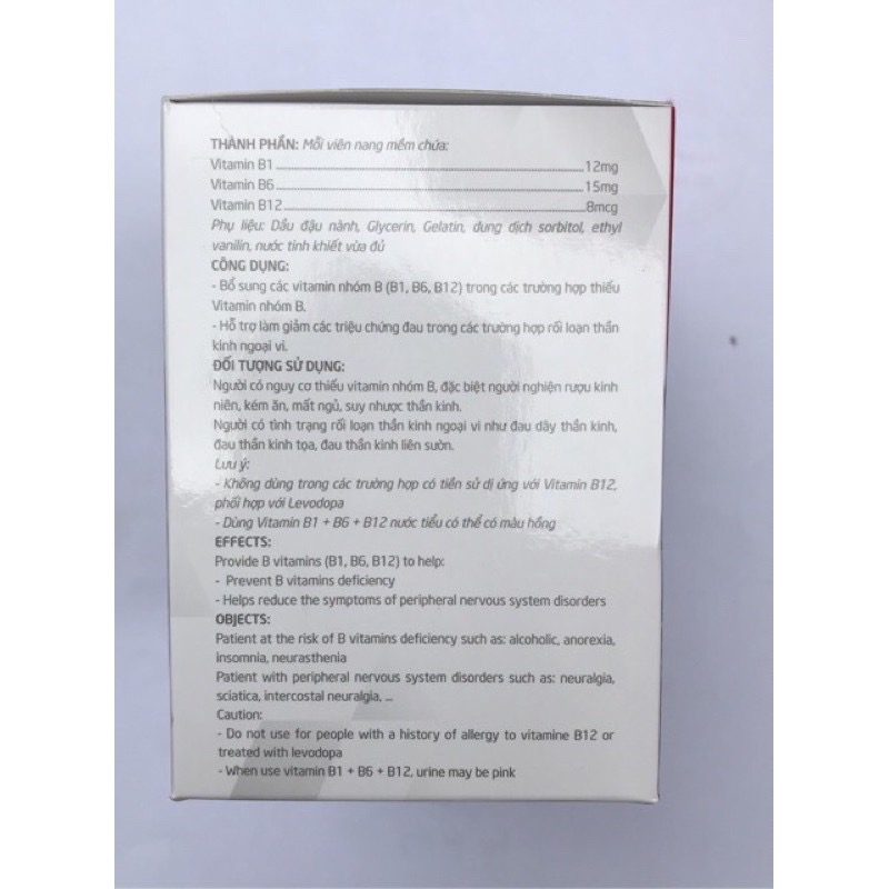 Soft 3B Vitamin Plus bổ sung các vitamin nhóm B (B1, B6, B12) trong các trường hợp thiếu Vitamin nhóm B. Hỗ trợ là giảm các triệu chứng đau trong các trường hợp rối loạn thần kinh ngoại vi. 1. THÀNH...