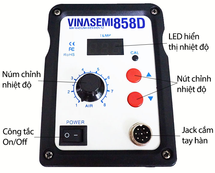 Mua tại TiktokVinasemi 858D là một máy khò có chế độ tự ngắt khi đủ nhiệt để duy trì nhiệt độ ở mức cần thiết, được sử dụng sửa chữa các mạch điện tử, thay thế, hàn dán linh kiện một cách dễ dàng.
