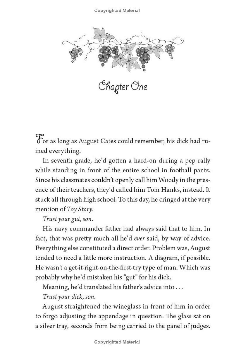 August Cates may own a vineyard, but he doesn’t know jack about making wine. He’s determined to do his late best friend proud, no matter what it takes. Except his tasting room is empty, his wine is disgusting (seriously, he once saw someone gag), and his buddy’s legacy is circling the drain. No bank will give him the loan he needs to turn the business and then the gorgeous, feisty heiress knocks on his door.