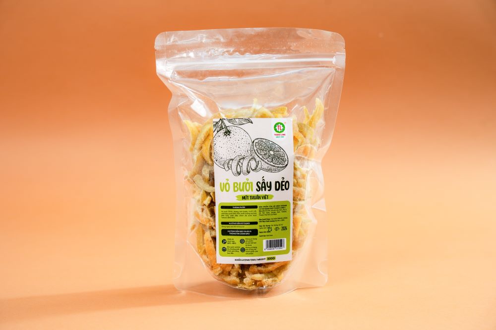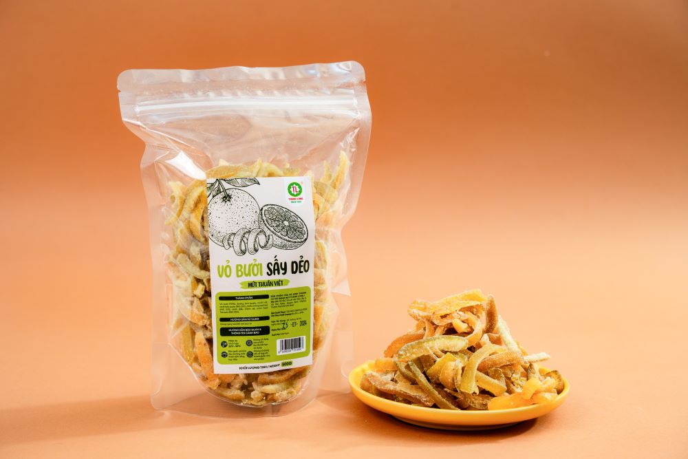 VỎ BƯỞI SẤY DẺO Mứt Thuần Việt THÀNH PHẦN : Vỏ Bưởi (70%), đường tinh luyện, muối i-ốt, chất bảo quản (E202), chất chống oxy hóa (E223), chất điều chỉnh độ acid: Acid Tartaric (E334)