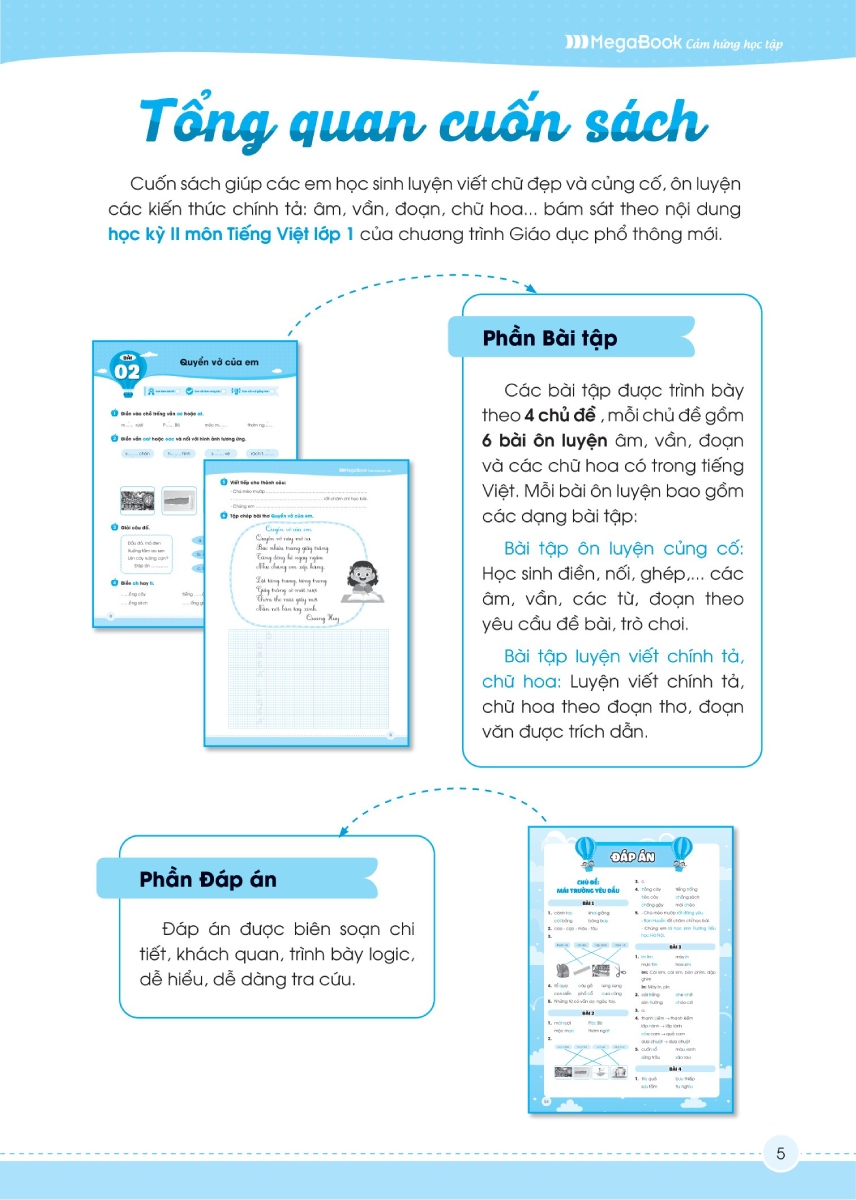 - Sách được chia làm 2 phần chính: Phần bài tập: Được trình bày theo 4 chủ đề, mỗi chủ đề là 6 bài ôn luyện về âm, vần, đoạn và các chữ hoa có trong Tiếng Việt Phần đáp án: Được biên soạn chi tiết, logic, dễ hiểu và tra cứu dễ dàng