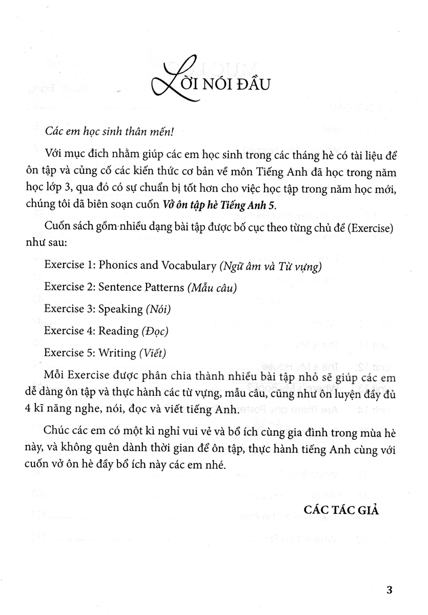Với mục đích nhằm giúp các em học sinh trong các tháng hè có tài liệu để ôn tập và củng cố các kiến thức cơ bản về môn Tiếng Anh đã học trong năm học , qua đó có sự chuẩn bị tốt hơn cho việc học tập trong năm học mới, chúng tôi đã biên soạn cuốn Vở ôn tập hè Tiếng Anh 5.
