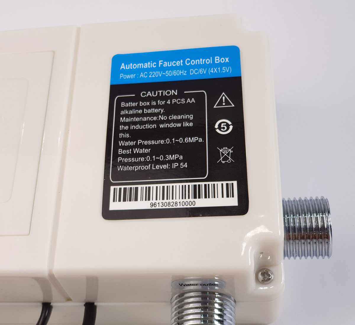 Áp lực nước : 0.1 - 0.6MPa Nguồn nước sử dụng : 1 nguồn ( nước lạnh) Nhiệt độ nước sử dụng : 0.1 - 45 độ C. Với mắt cảm ứng cực nhạy , nhận biết được đối tượng sử dụng trong phạm vi từ 15 đến 30cm. Chỉ cần để tay trước vòi, van mở sẽ kích hoạt mở nước, khi đưa tay ra khỏi phạm vi, van sẽ tự ngắt.