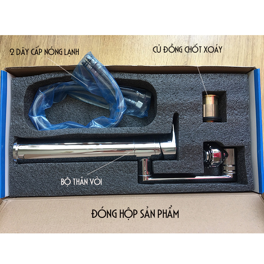 Đóng gói: Bộ sản phẩm gồm: 1 thân vòi, 1 củ đồng chốt xoáy, 2 dây cấp nóng lạnh