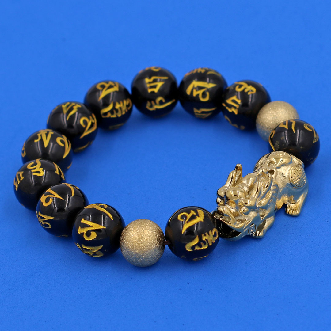Thông tin sản phẩm : Vòng chuỗi đeo tay đá thạch anh đen khắc lục tự chân ngôn mạ vàng 14 ly ( size lớn ) charm tỳ hưu và bi inox vàng, vòng tay chuỗi hạt