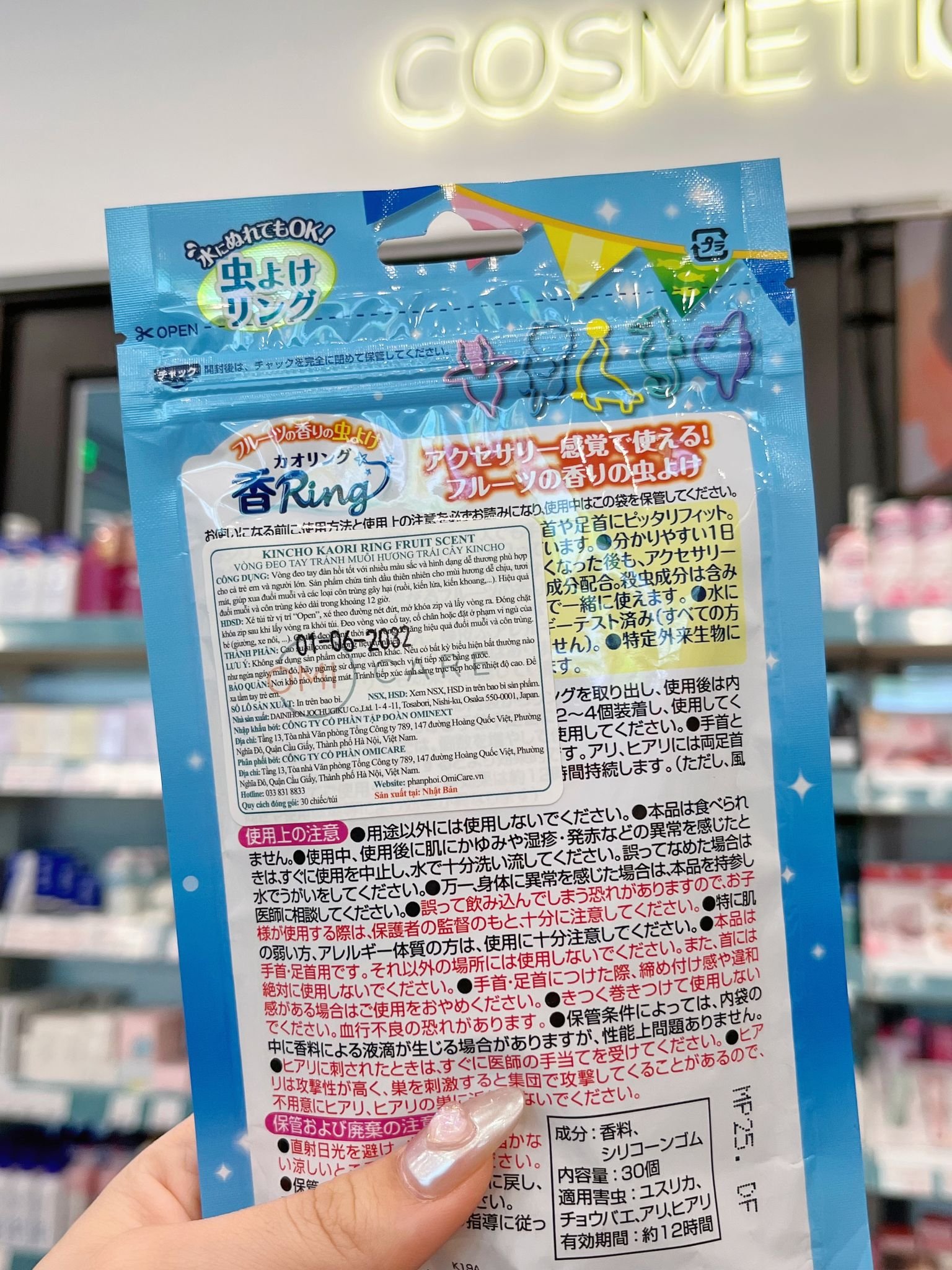 THÀNH PHẦN: Cao su silicone, hương liệu tự nhiên. CÔNG DỤNG Vòng đeo tay đàn hồi tốt với nhiều màu sắc và hình dạng dễ thương phù hợp cho cả trẻ em và người lớn. Sản phẩm chứa tinh dầu thiên nhiên cho mùi hương dễ chịu, tươi mát, giúp xua đuổi muỗi và các loại côn trùng gây hại (ruồi, kiến lửa, kiến khoang,...). Hiệu quả đuổi muỗi và côn trùng kéo dài trong khoảng 12 giờ. CÁCH DÙNG Hướng dẫn sử dụng: Xé túi từ vị trí “Open”, xé theo đường nét đứt, mở khóa zip và lấy vòng ra. Đóng chặt khóa zip sau khi lấy vòng ra khỏi túi. Đeo vòng vào cổ tay, cổ chân hoặc đặt ở phạm vi ngủ của bé (giường, xe nôi, ...). Có thể đeo đồng thời 2-4 vòng để tăng hiệu quả đuổi muỗi và côn trùng. BẢO QUẢN LƯU Ý: Không sử dụng sản phẩm cho mục đích khác. Nếu có bất kỳ biểu hiện bất thường nào như ngứa ngáy, mẩn đỏ, hãy ngừng sử dụng và rửa sạch vị trí tiếp xúc bằng nước. BẢO QUẢN: Nơi khô ráo, thoáng mát. Tránh tiếp xúc ánh sáng trực tiếp hoặc nhiệt độ cao. Để xa tầm tay trẻ em. NHÀ SẢN XUẤT DAINIHON JOCHUGIKU Co.,Ltd. 1-4-11, Tosabori, Nishi-ku, Osaka 550-0001, Japan.
