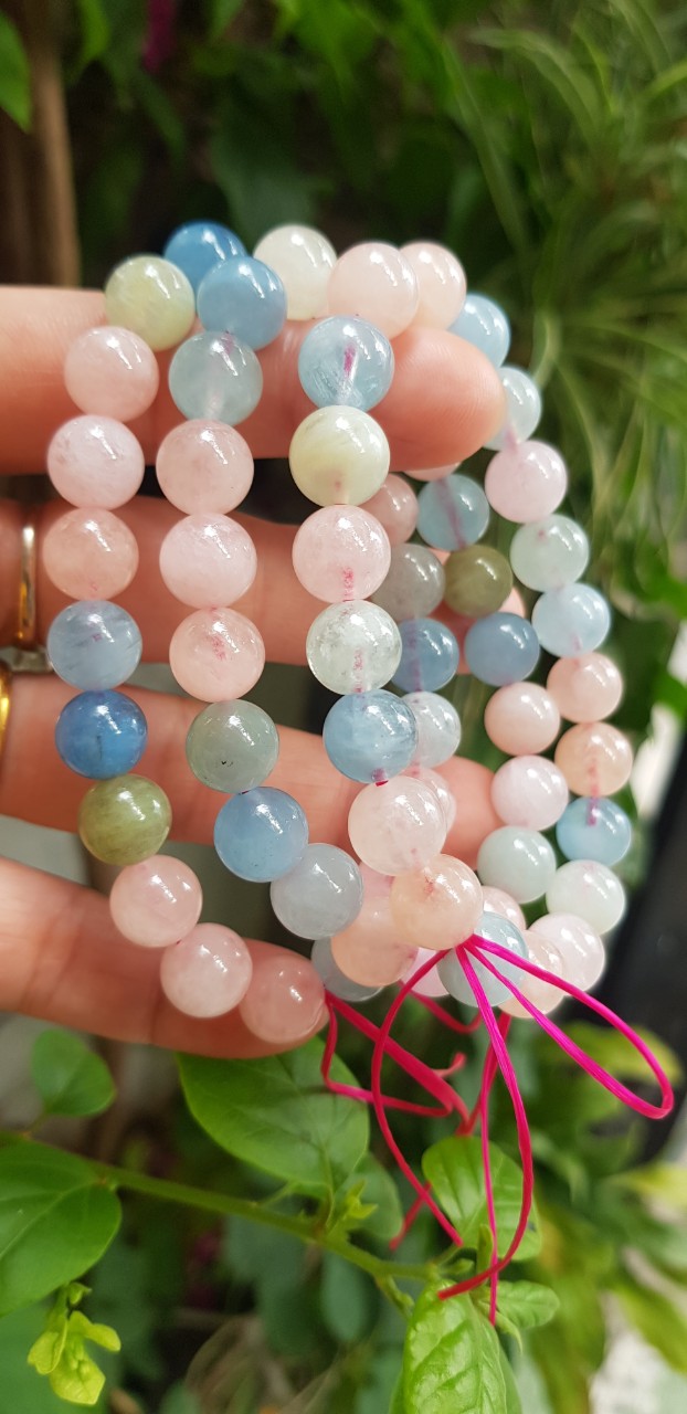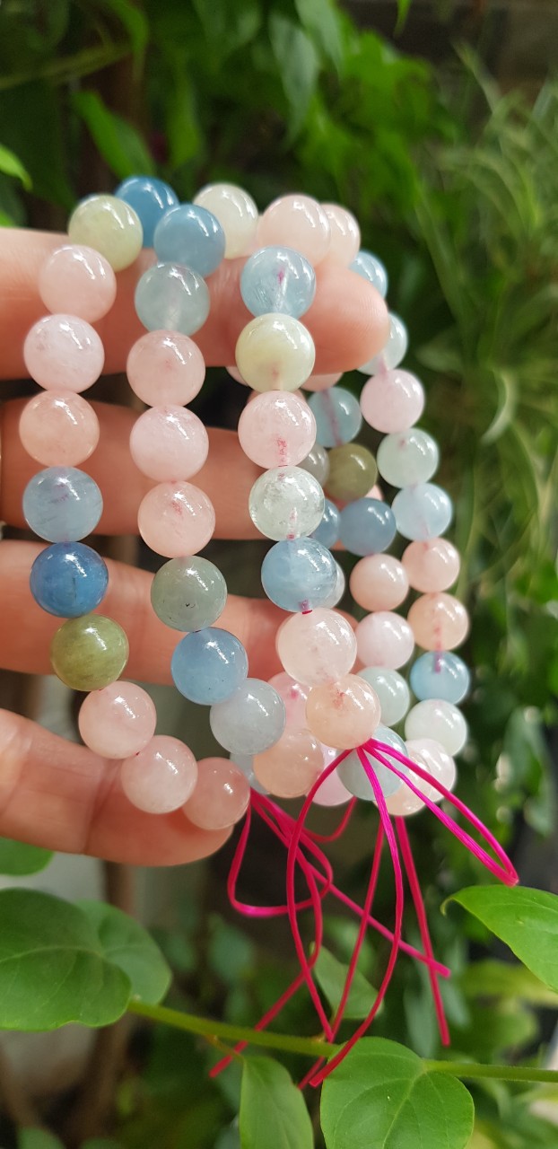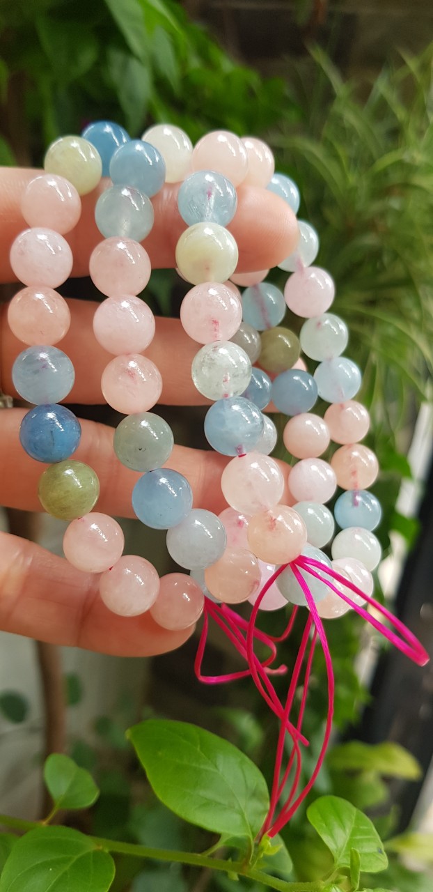 Vòng tay chuỗi đá Beryl tự nhiên đa sắc màu tươi sáng bóng mượt đẹp size hạt 9mm là sự phối hợp tông màu hồng ngọt ngào với xanh dương xanh nước biển đậm nữ đeo tay đẹp xinh tay may mắn tốt cho sức khỏe công việc tài lộc