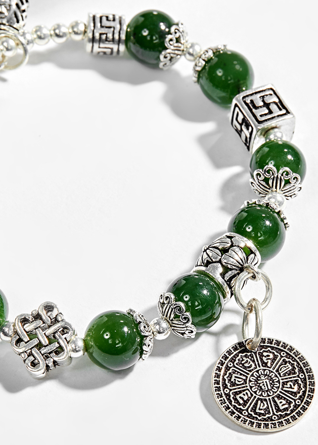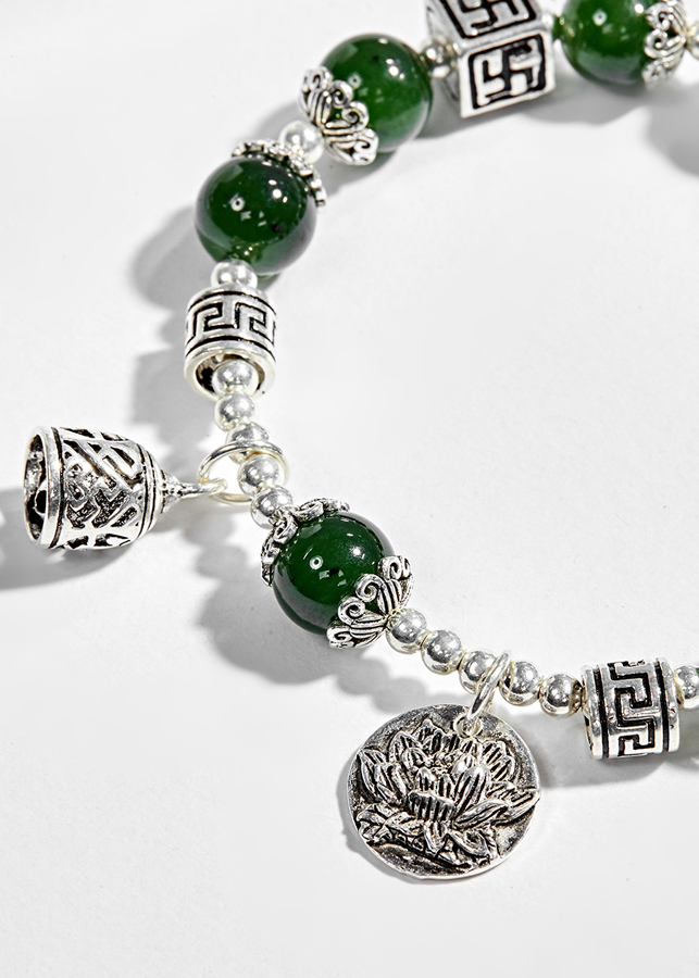 Vòng tay ngọc bích phối charm hoa sen (10mm) phù hợp với người mệnh Mộc và mệnh Hoả, mang lại may mắn và giúp làm cho mối quan hệ của bạn với cấp trên và đồng nghiệp trở nên suôn sẻ.
