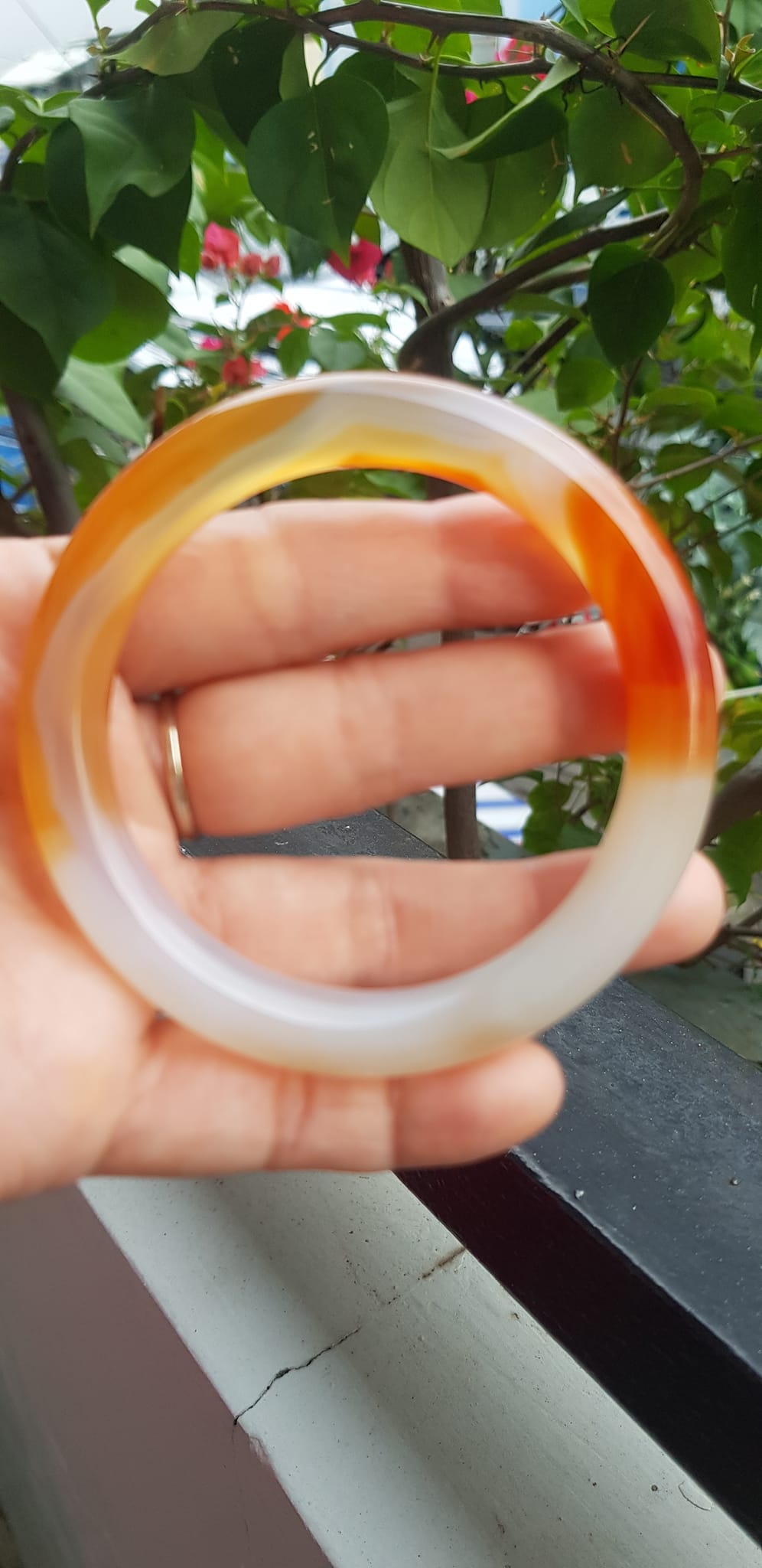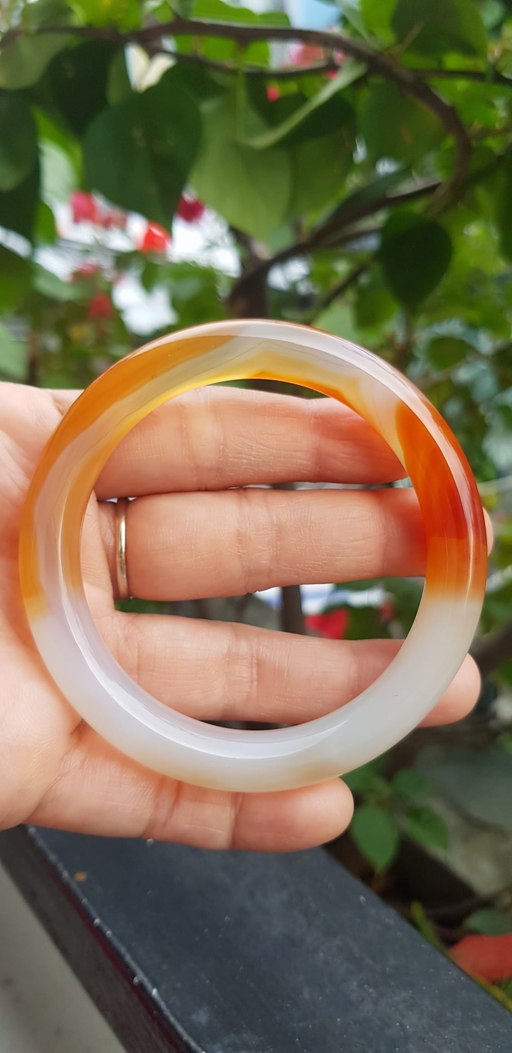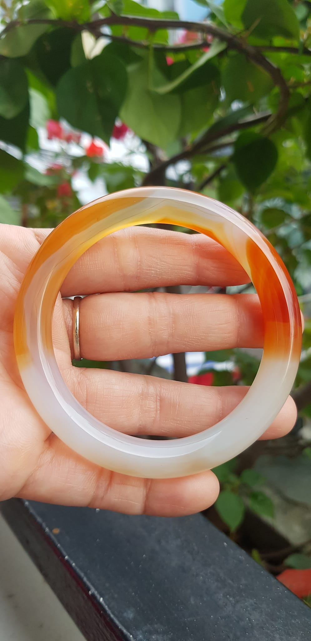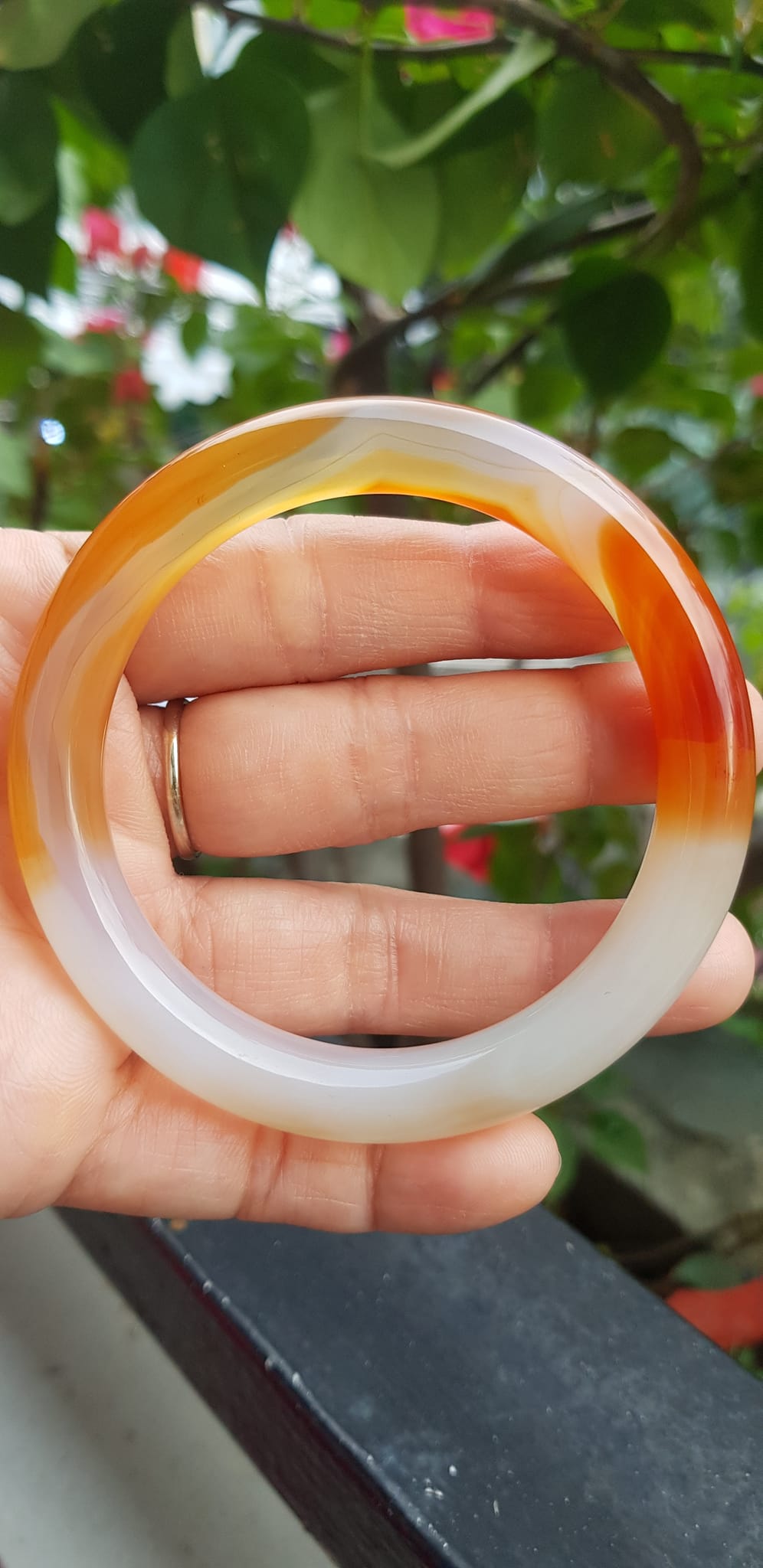 Vòng tay Nữ đá mã não đỏ cam trắng Ni 56mm x chột to 9mm trắng đỏ cam nhẹ 1 bên vân Nữ 55kg-63kg đeo