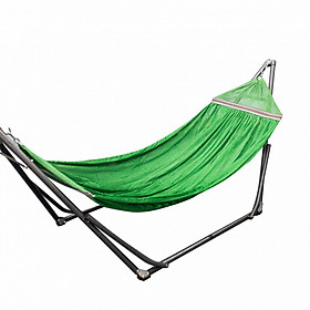 Ống thép, sơn tĩnh điện. đường kính 27.0mm, chiều dày 0.9mm. 4 thanh chống uốn cong, thẩm mỹ, thông thoáng, an toàn. Võng lưới sợi 100% polyester, mềm mịn, có độ co giãn, lưới Xuất