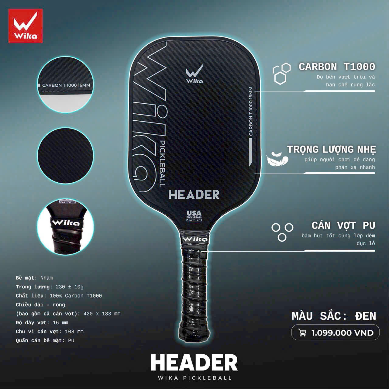 NEW   | NÂNG TẦM TRẬN ĐẤU - ĐẬM CHẤT THỜI THƯỢNG   Không màu mè, nhưng  Header chắc chắn sẽ chinh phục Fan Pickleball bởi thiết kế tinh tế, thời thượng & hiệu năng vượt bậc!   Hoạ tiết tối giản với màu đen chủ đạo kết hợp các điểm nhấn, họa tiết màu trắng tinh tế, hiện đại mà mạnh mẽ, nhưng vẫn không kém phần nổi bật khi trên sân.   Dòng vợt Pickleball ĐẦU TIÊN  sử dụng chất liệu Carbon T1000, Header sở hữu độ chi tiết cao trên từng vị trí mặt vợt - tăng độ chính xác trong từng cú đánh.   Đã đến lúc bạn "Level Up" kĩ năng của mình, trở thành người dẫn đầu với a Header -mạnh nhất trên đấu trường Pickleball: TRỌNG LƯỢNG SIÊU NHẸ Chỉ khoảng 230g, vợt hỗ trợ tối đa cho những cú đánh tốc độ cao và phản xạ nhanh trên sân.   ĐỘ BỀN VƯỢT TRỘI Sợi carbon T1000 có khả năng chịu lực rất tốt, giúp vợt chịu được va đập mạnh mà không bị biến dạng hay hư hỏng nhanh chóng.   LỰC ĐÁNH MẠNH MẼ Vợt có độ cứng cao, giúp người chơi kiểm soát bóng tốt hơn, đặc biệt quan trọng trong các cú đánh cần sức mạnh và độ chính xác cao.   Thông số kỹ thuật: