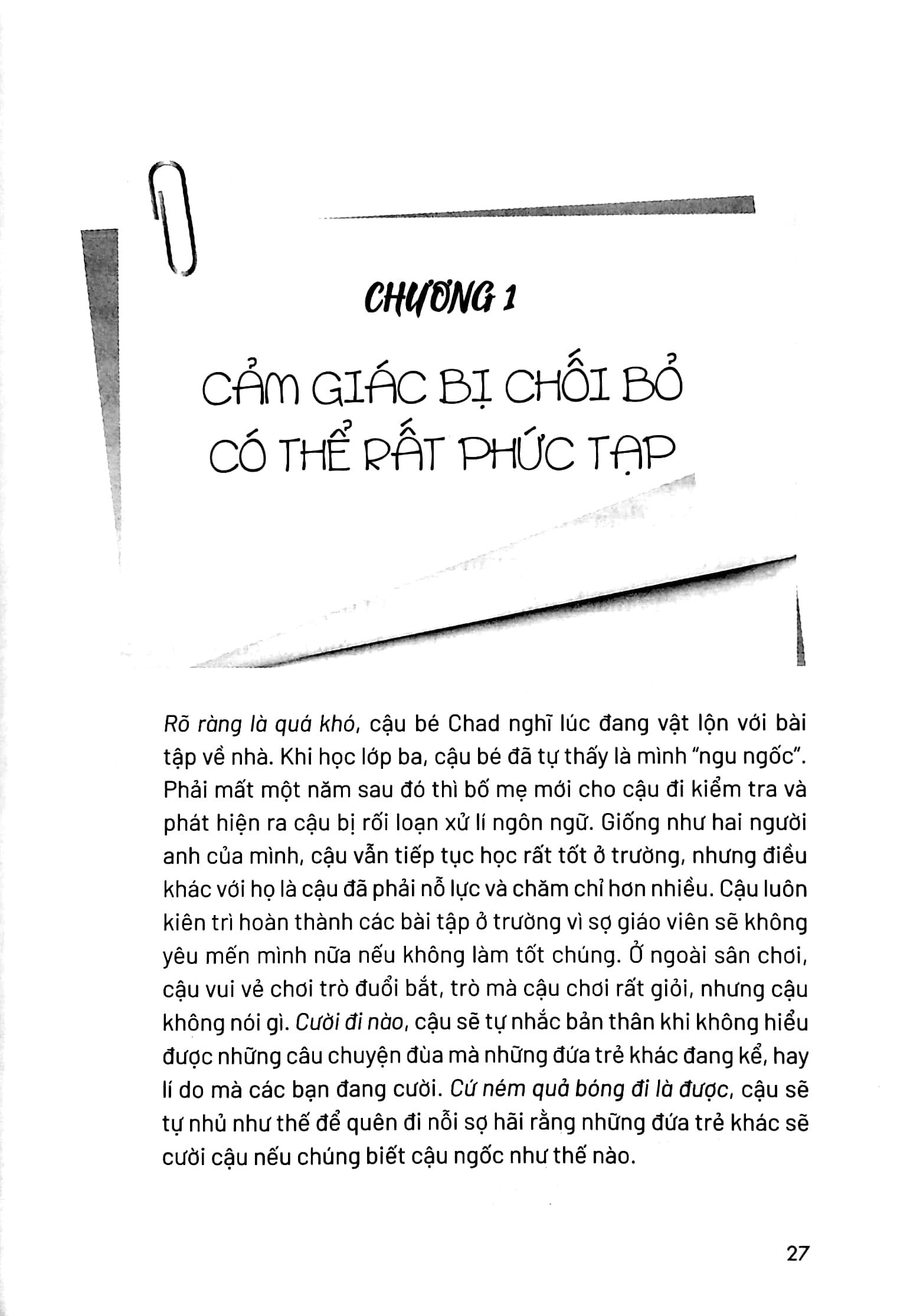 Cuốn sách này sẽ giúp bạn làm điều đó. Bạn sẽ tìm thấy trong cuốn sách này các chiến lược giúp bạn nuôi dưỡng khả năng tự nhận thức về bản thân với lòng trắc ẩn và quản lí các cảm xúc khó chịu, từ đó giải phóng bạn khỏi nỗi sợ hãi sự chối bỏ, đưa bạn đế với cảm giác thanh thản, tự do. Thay vì gục ngã bởi nó, bạn sẽ thấy sự chối bỏ là một cơ hội để bạn phát triển bản thân một cách sâu sắc, xây dựng đức tính kiên cường để đối mặt với những thách thức tương lai một cách tự tin và mạnh mẽ.